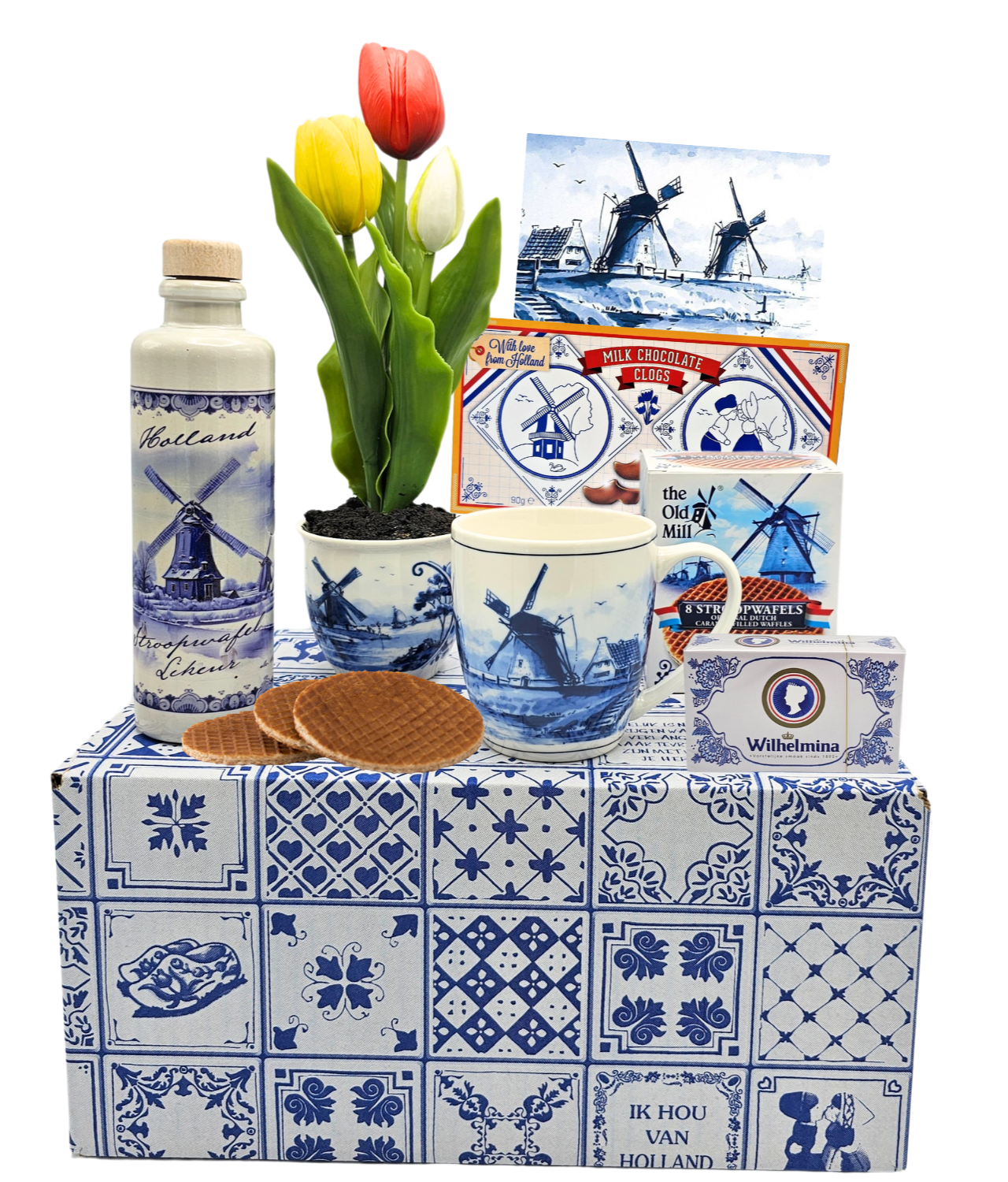 Een prachtige Delfts blauwe koffiemok, vergezeld van stroopwafels, chocolade en een verrukkelijke Hollandse likeur in een Delfts blauwe kruik.