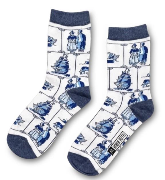 Geef je outfit een Hollandse touch met deze stijlvolle Delfts blauwe sokken van Robin Ruth. De witte sokken zijn versierd met iconische prints van molens, boerenparen en koeien. Dankzij het hoge katoengehalte blijven ze ook na veel wassen mooi en zacht.