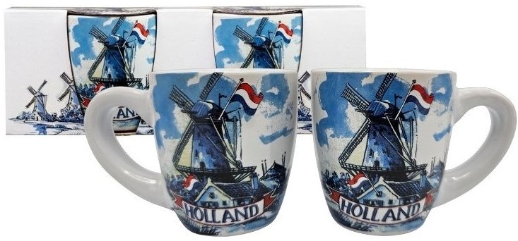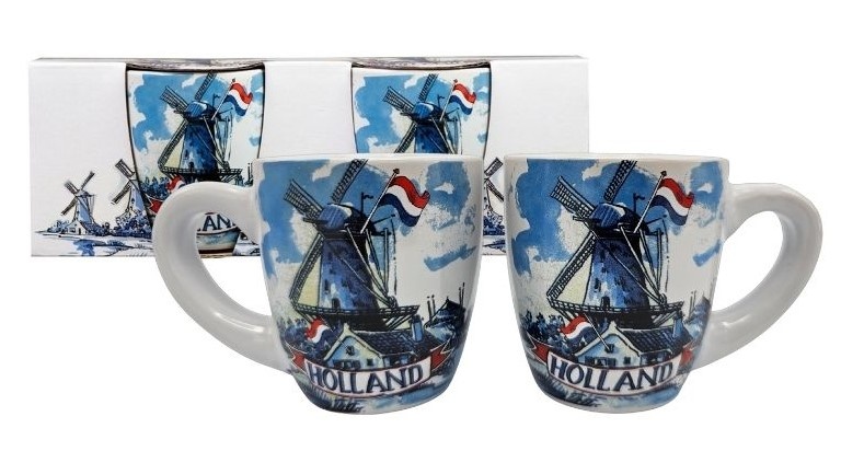 Leuke cadeau-set van 2 Holland espressomokjes met oor.gedecoreerd in fraaie blauwe tinten en uiteraard een Nederlandse vlag