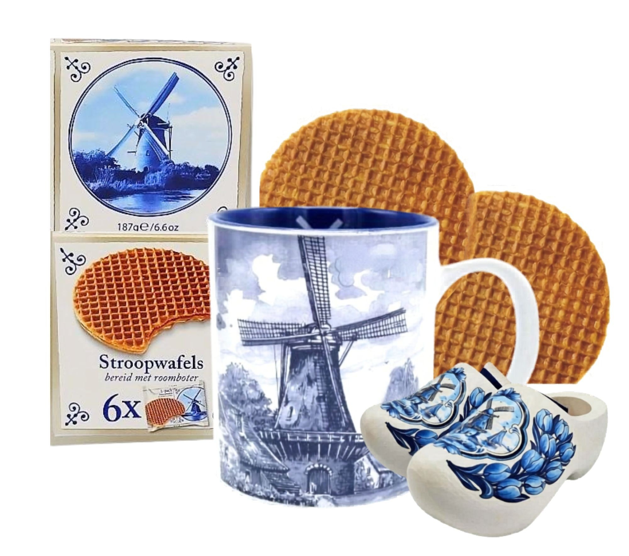 Geschenkset Delfts blauwe mok met stroopwafels en klompjes