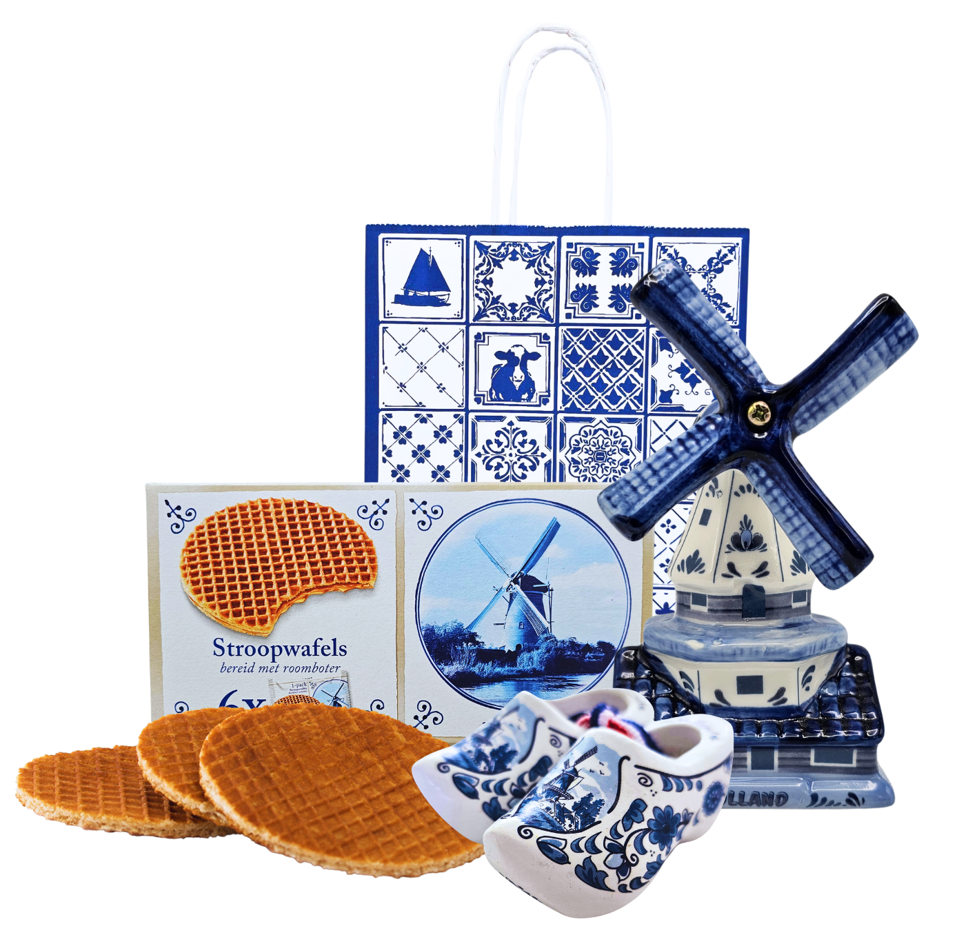 Geschenktasje - Typisch Hollands - Molen - stroopwafels en houten klompjes.