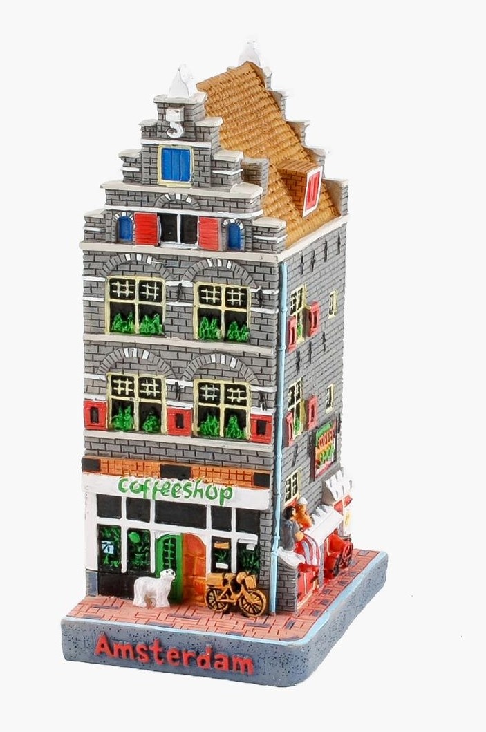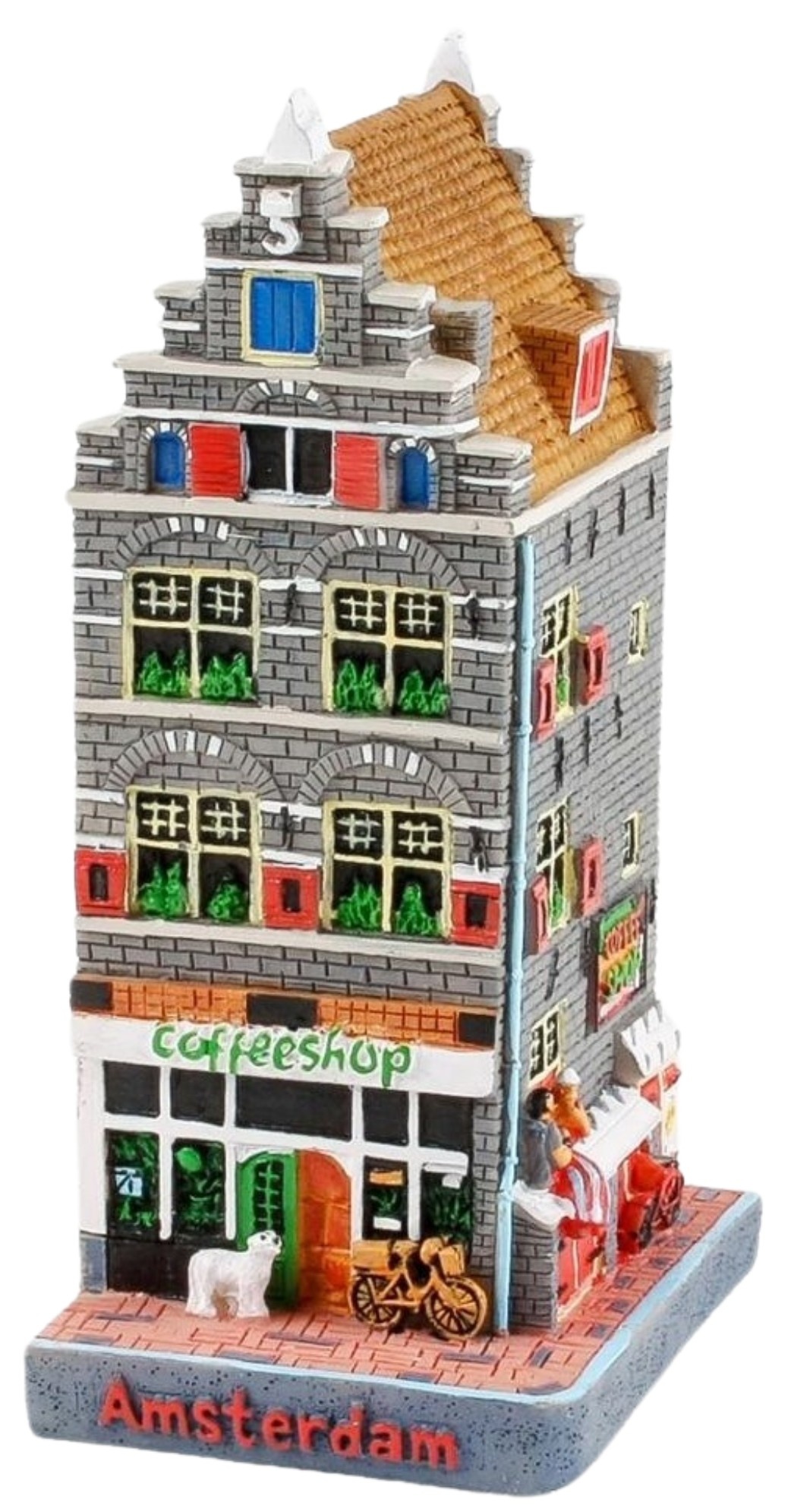 Grappig gevelhuisje van polystone, koffieshop 12 cm, met op de sokkel de tekst 'Amsterdam'. Een leuk souvenir voor verzamelaars.