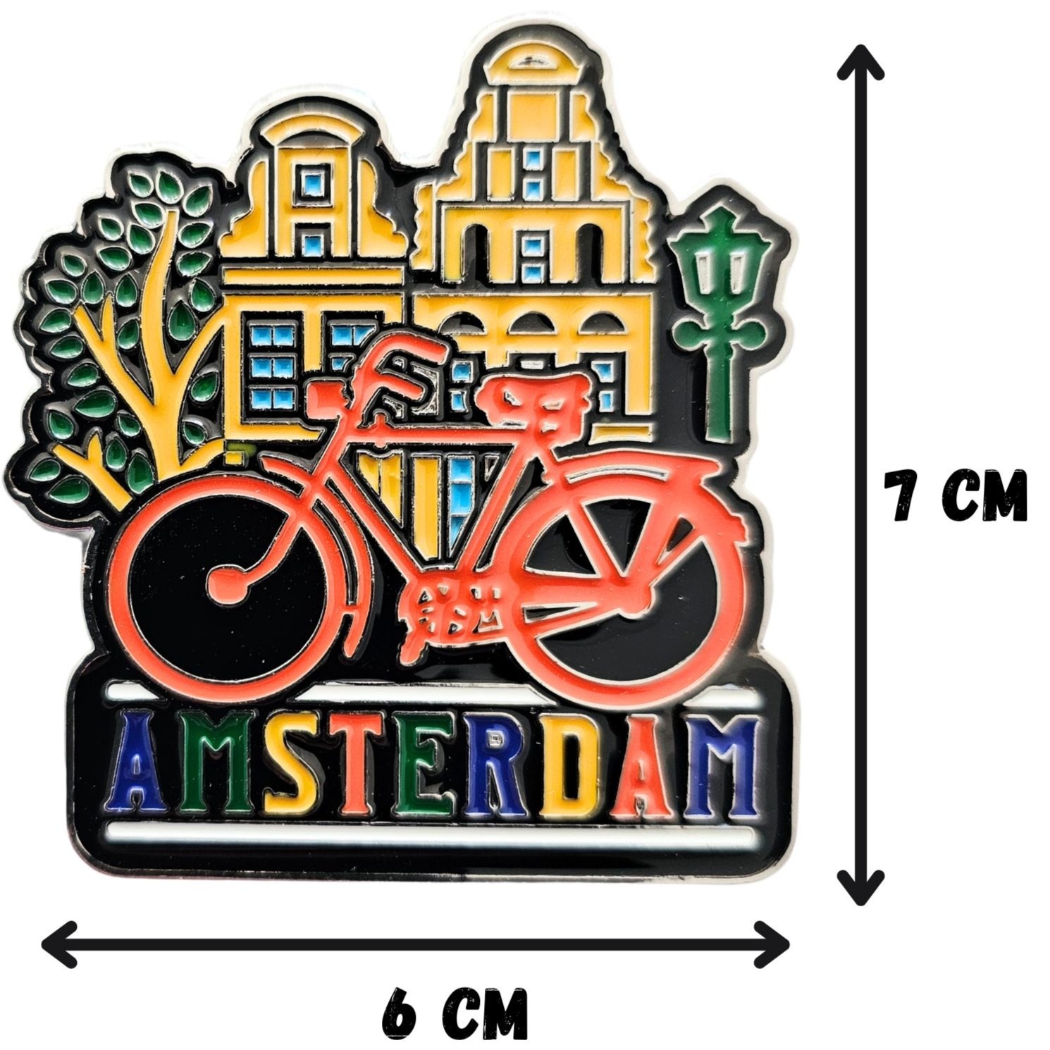 Gevelhuisjes met fiets en de tekst Amsterdam