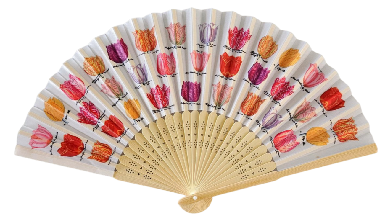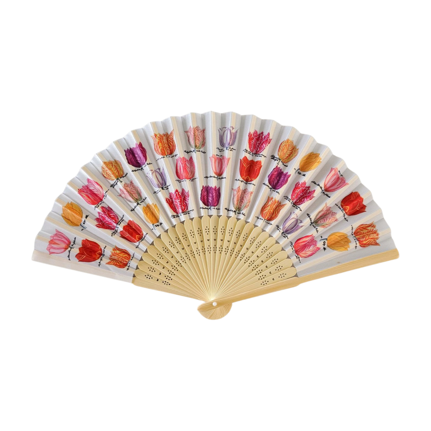Een mooie hand fan om de ergste hitte te verdrijven! De waaier is gemaakt van bamboo , met een print op stof.