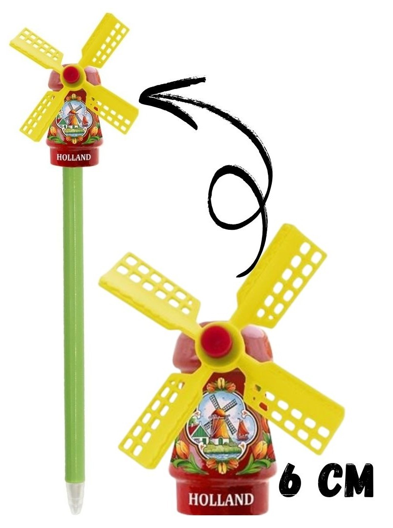 Deze balpen heeft een molentje op de top, en heeft een lengte van 16 cm.