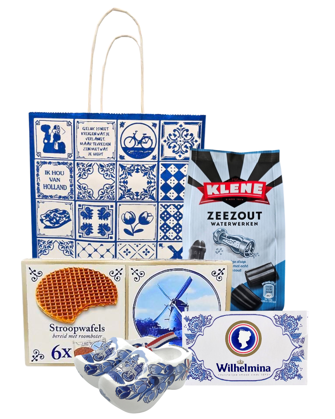 Tasje Delfts blauwe koek en snoep verpakkingen, en een Typisch Hollands klompje