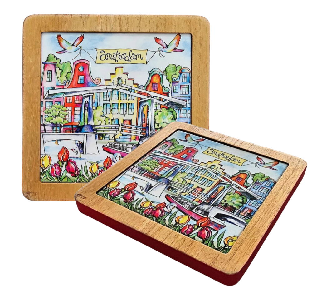 voorzien van een moderne ingelegde tegel met een afbeelding van de Magere Brug in Amsterdam.