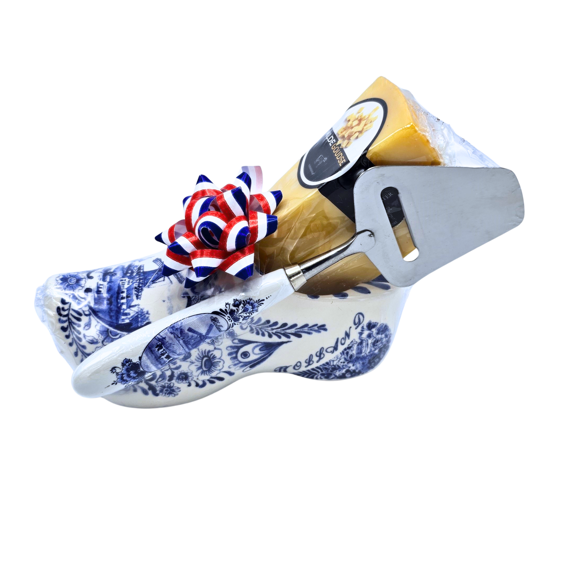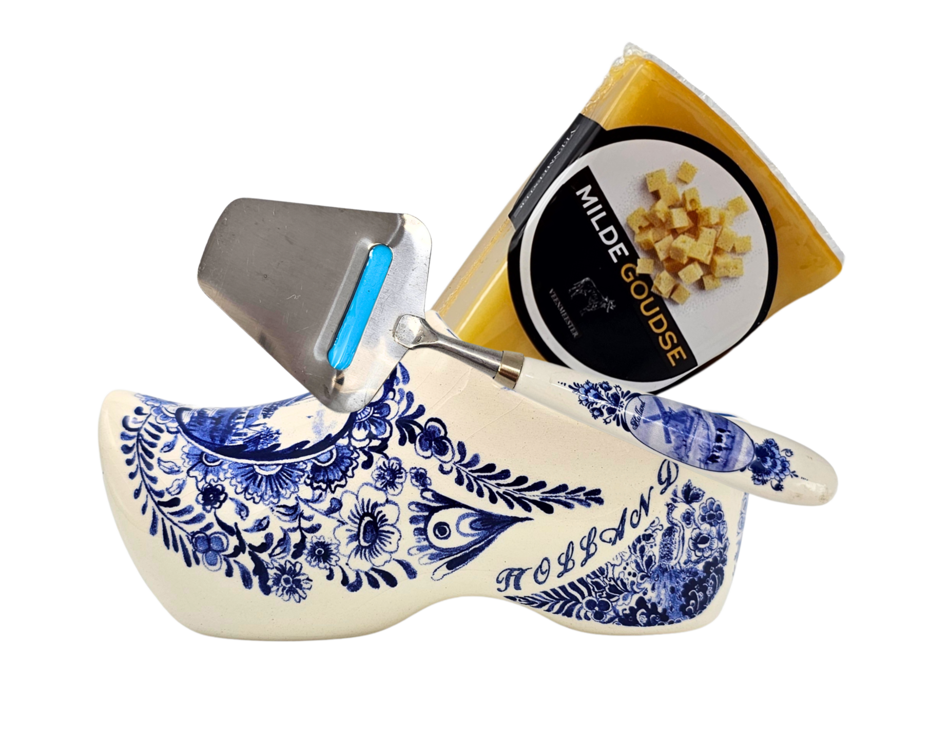 Dit kaasje is samen verpakt met kaasschaaf 18cm in een Delfts blauwe klomp van keramiek