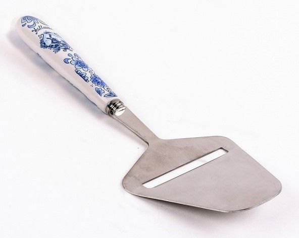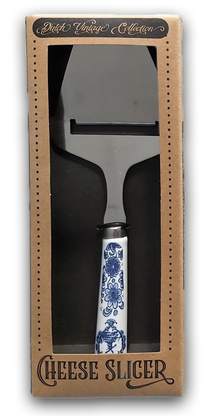 Een mooie Delft blauwe kaasschaaf met keramiek handvat in een geschenkverpakking.