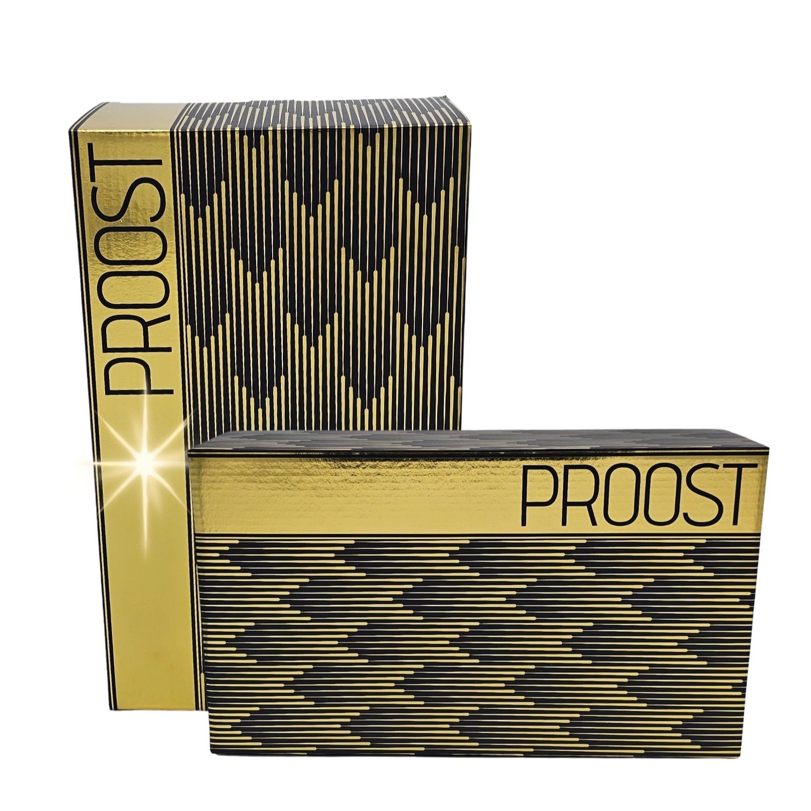 verpakt in een robuuste luxe doos met gouden en zwarte accenten.