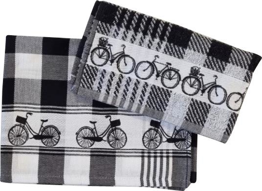 Prachtig keukentextiel en zeker Typisch Hollands.Wat een mooi design- in zwart-wit met fietsenHanddoek en theedoek.
