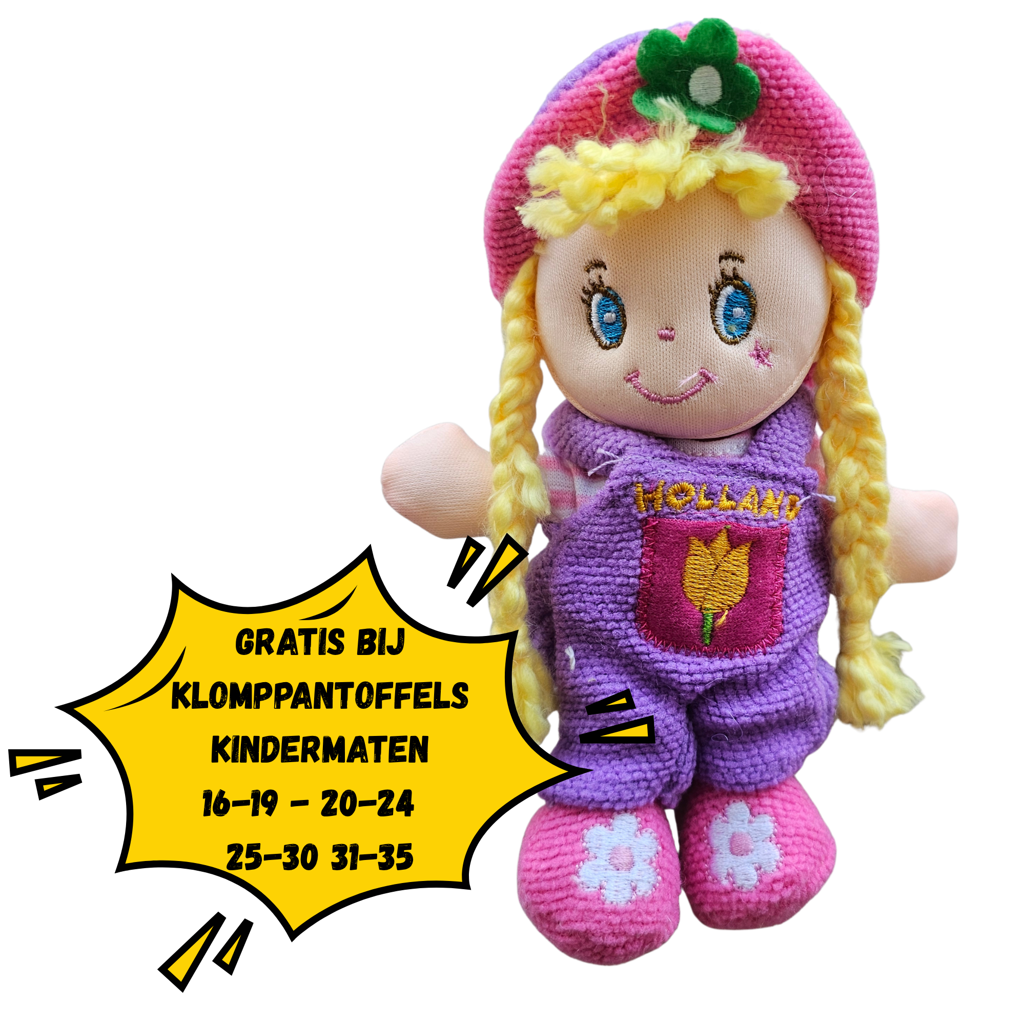 Speciaal voor de kleintjes: bij aankoop van deze klomppantoffels in kindermaten ontvang je nu een GRATIS knuffelpopje!