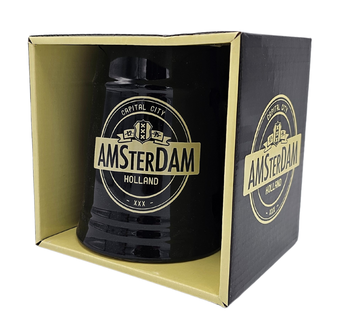 Zwarte bierpul met een afbeelding van een logo van Amsterdam