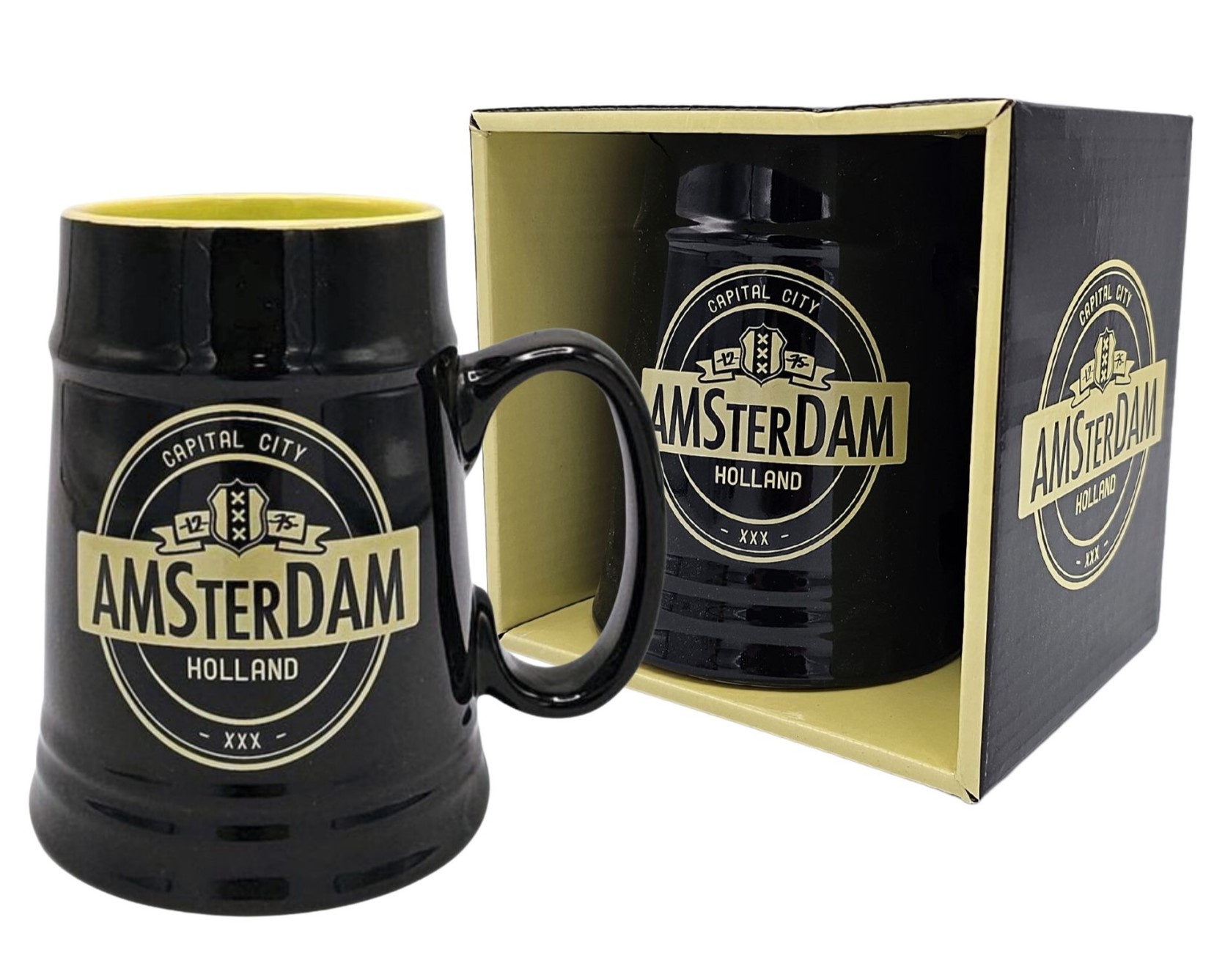 Luxe Zwarte biermok- Amsterdam 13.5 cm Zwarte bierpul met een afbeelding van een logo van Amsterdam Vervaardigd van stijlvol aardewerk Afmeting: 17 cm