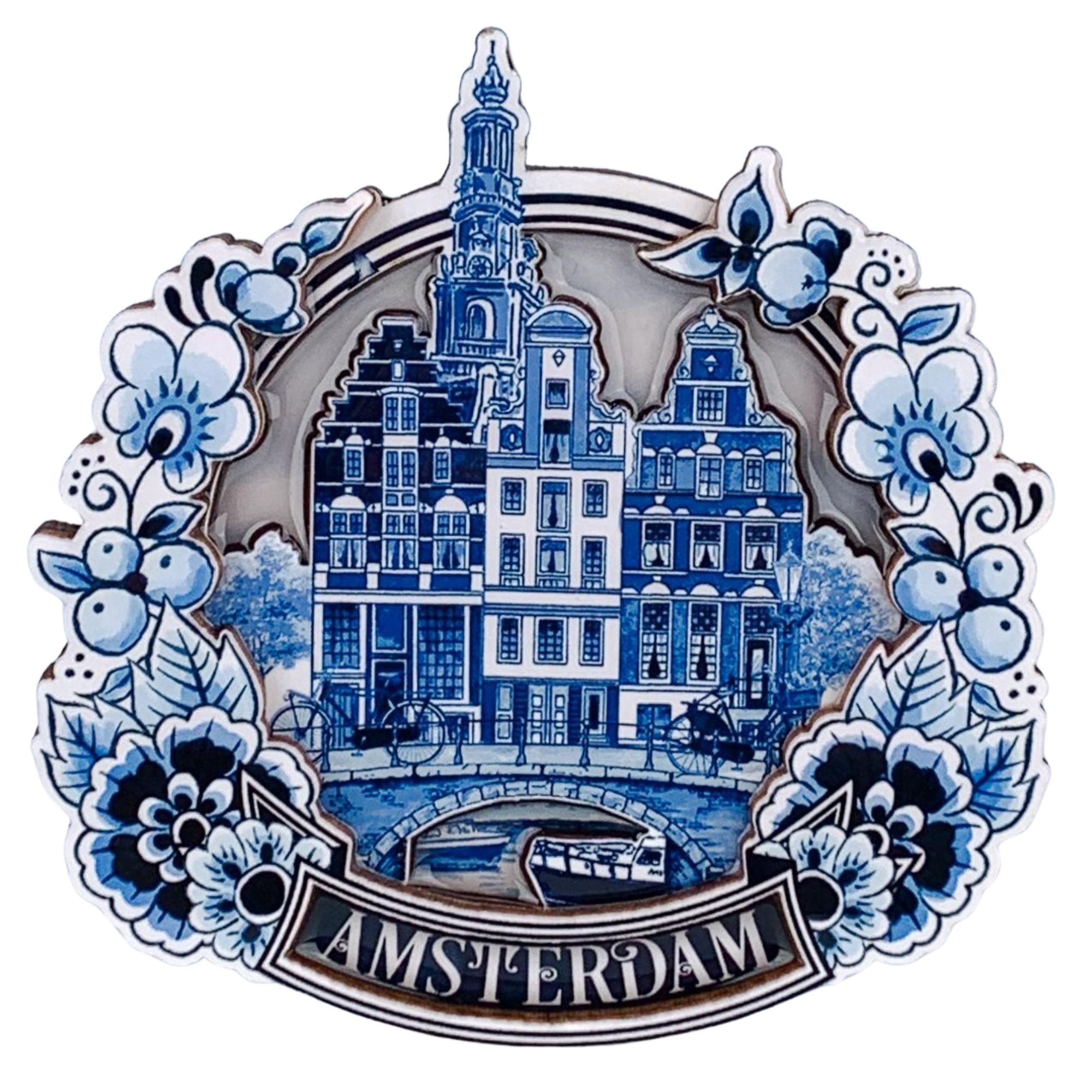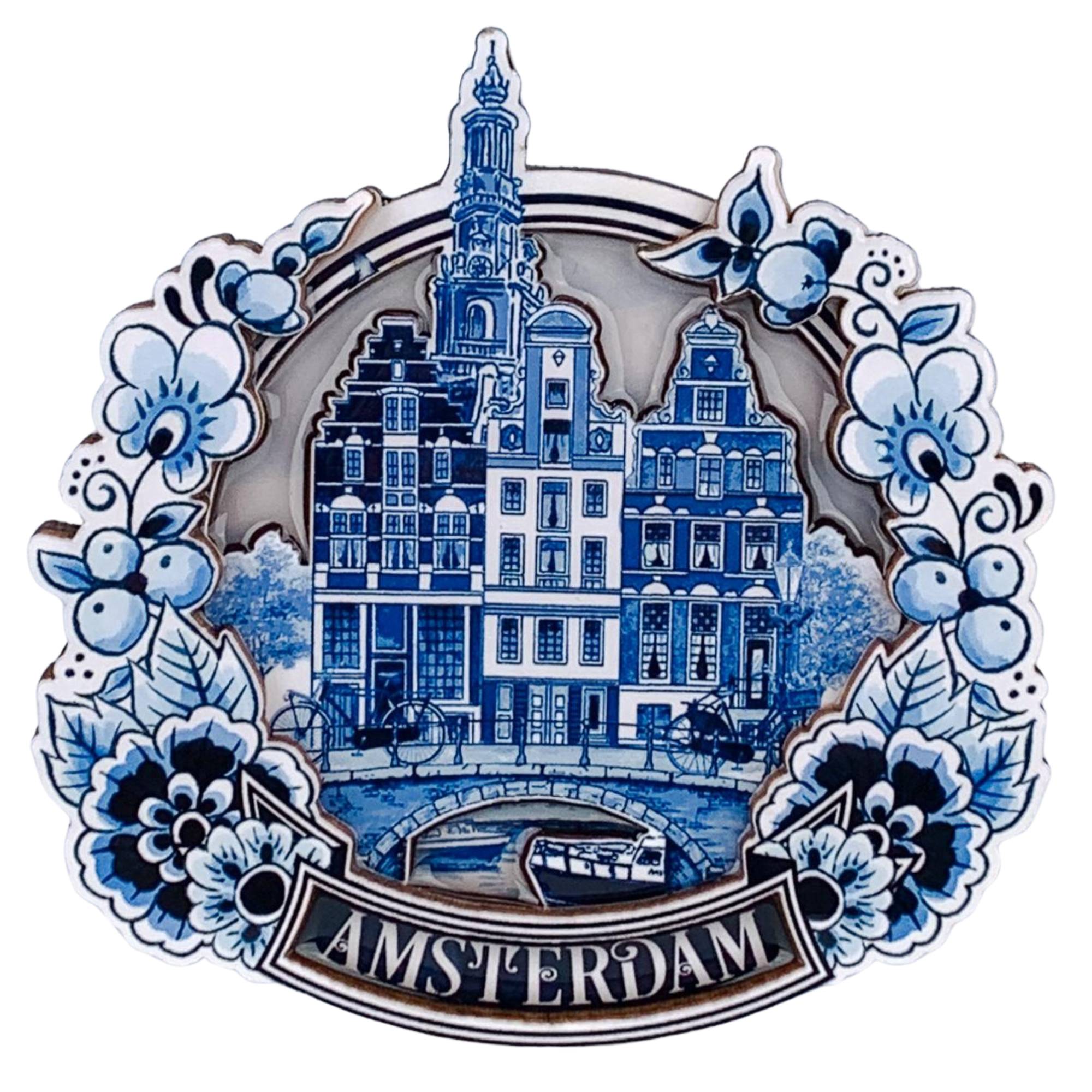 Deze magneet toont eens te meer de schoonheid van Delfts blauw en Amsterdamse grachtenpandjes