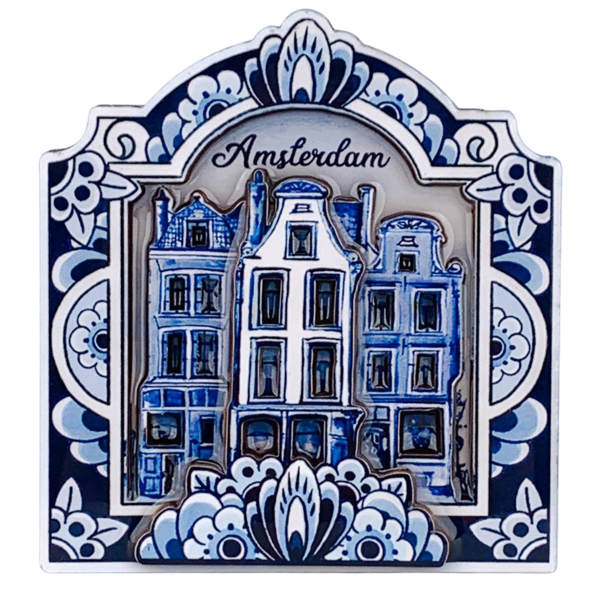 Deze magneet toont eens te meer de schoonheid van Delfts blauw en Amsterdamse grachtenpandjes