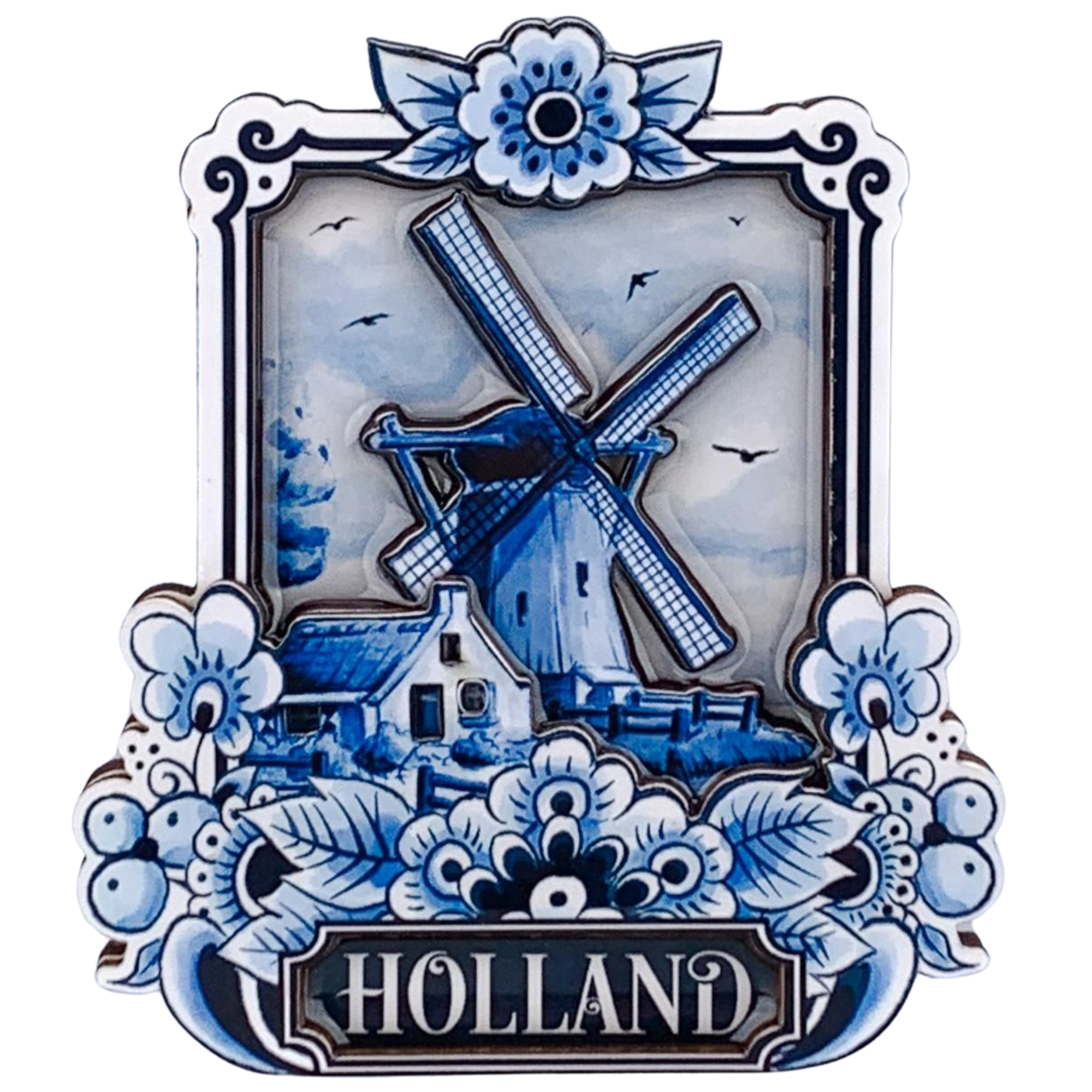 Deze magneet toont eens te meer de schoonheid van Delfts blauw en Nederlandse molens