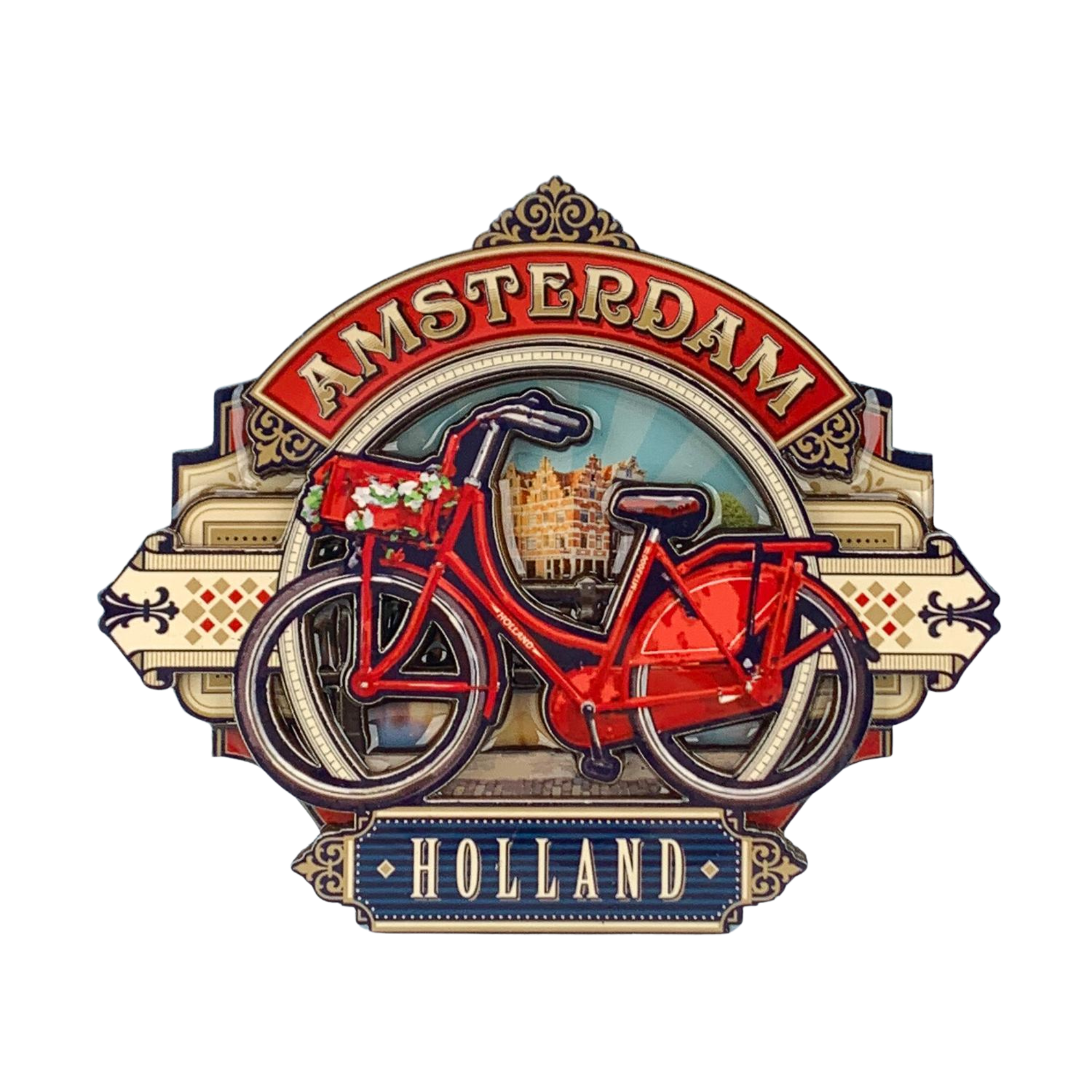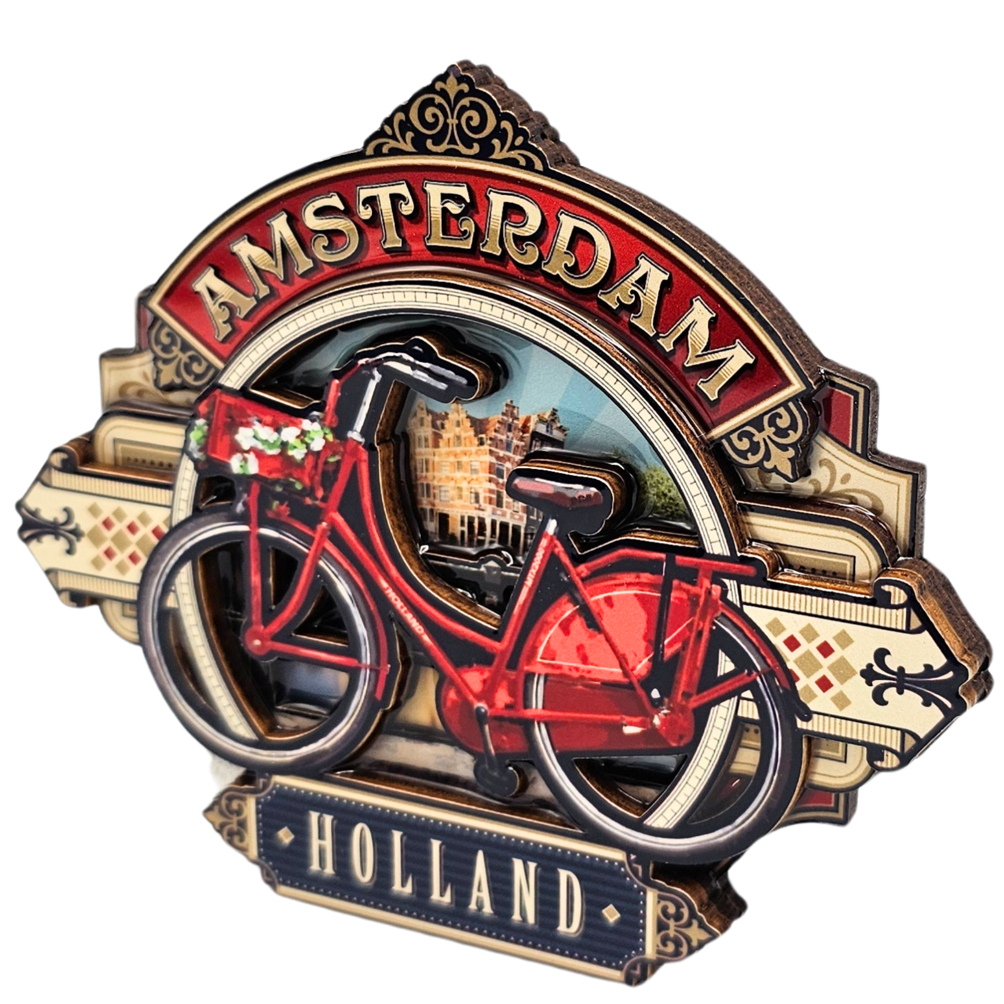 Fraaie magneet met rode fiets in victoriaanse decoratie.