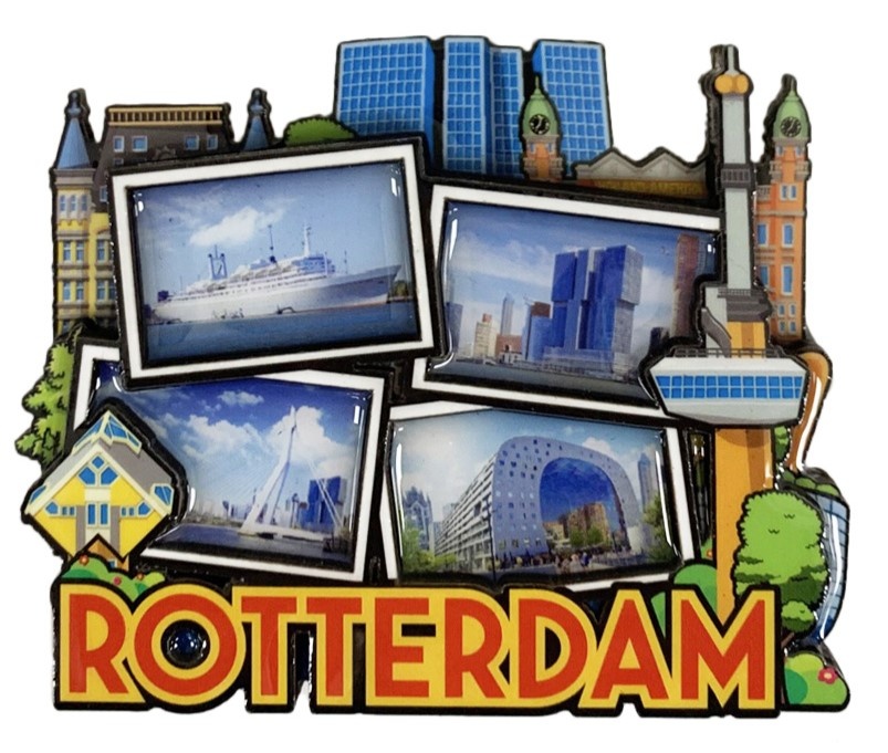 Magneet Rotterdam met een compilatie van de meest bekende gebouwen van RotterdamIngelijst tot een mooi geheel - op de foto`s - strak blauw luchtenTekst: Rotterdam