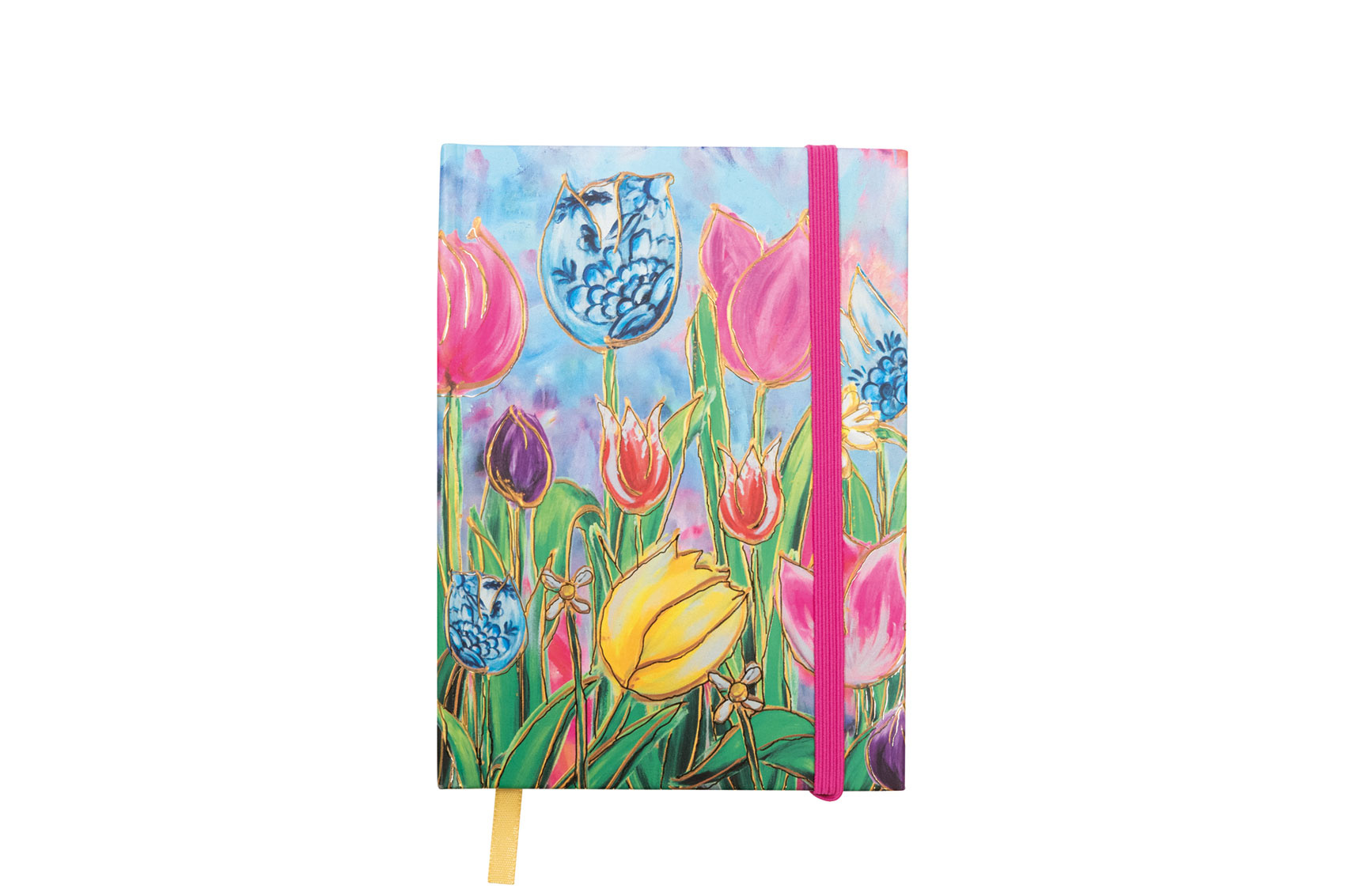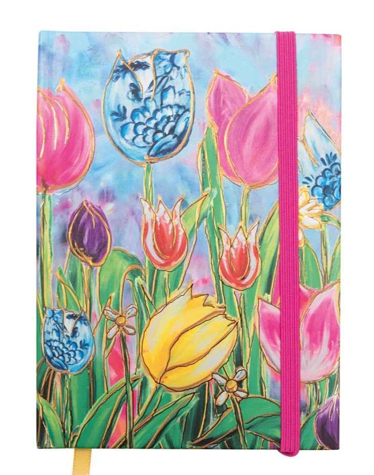 Het boekje is versierd met een schitterende, kleurrijke tulpenprint die direct een
