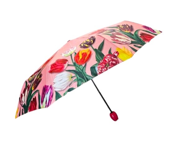Deze paraplu is opvouwbaar, super handzaam.Waanzinnig mooie print in Roze-Rode en Orange tinten.