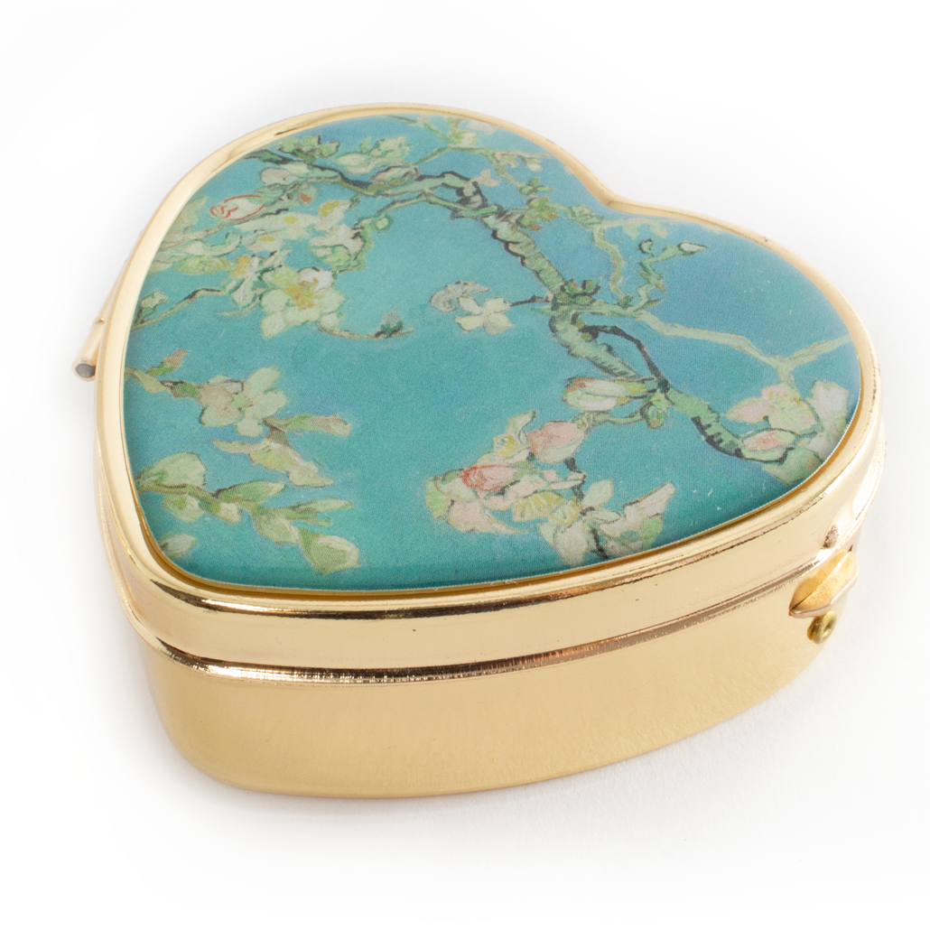 Met een druk op het knopje opent u het hartvormige pillendoosje wat ook een spiegtelje heeft