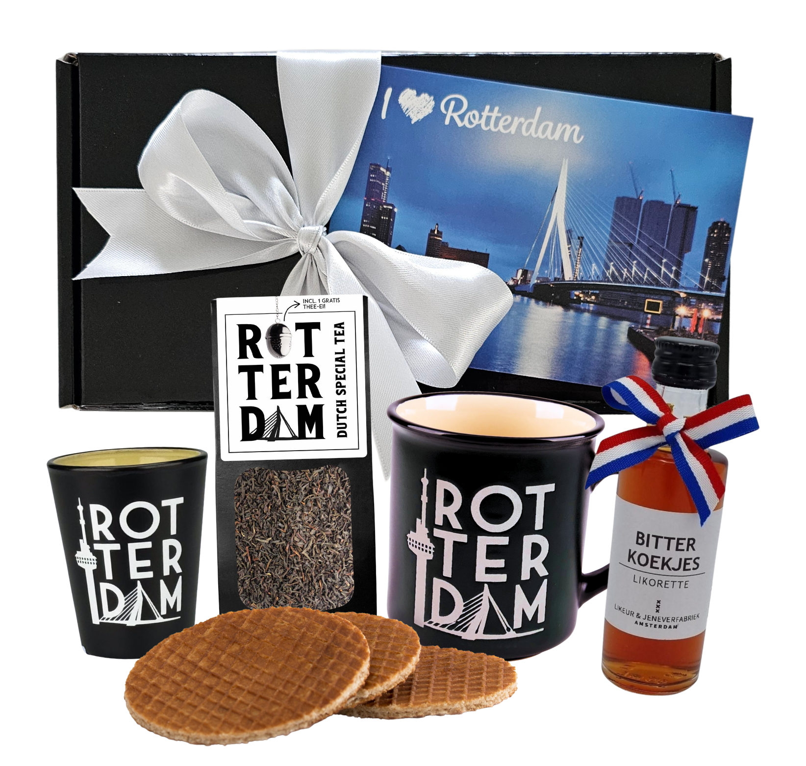 Super stevige mok - Erasmusbrug en Euromast RotterdamAls cadeau-set geleverd met stroopwafels, thee en een handig thee-ei.