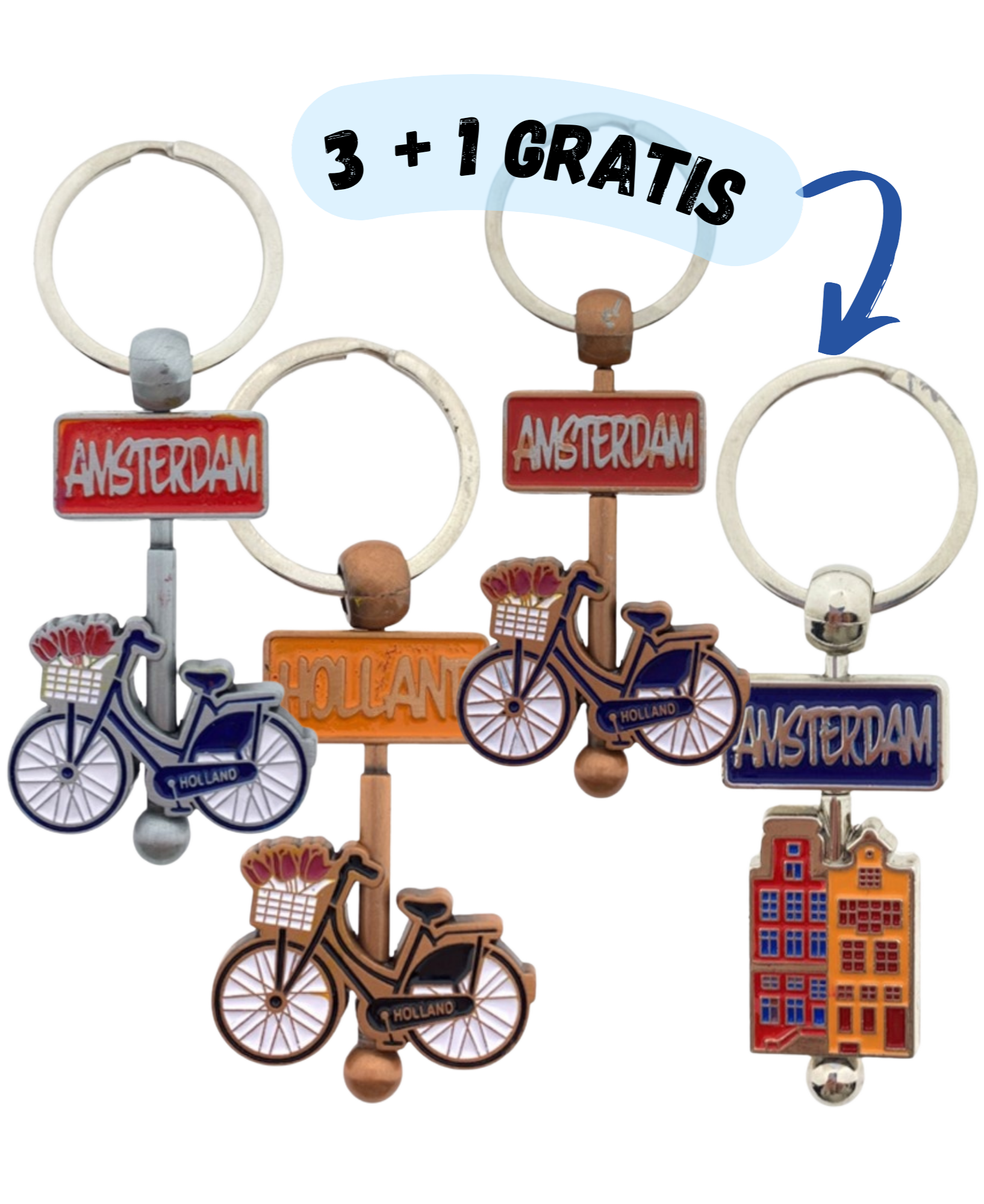 Set van 4 sleutelhangers - Fietsen en Amsterdamse grachtenpandjes.