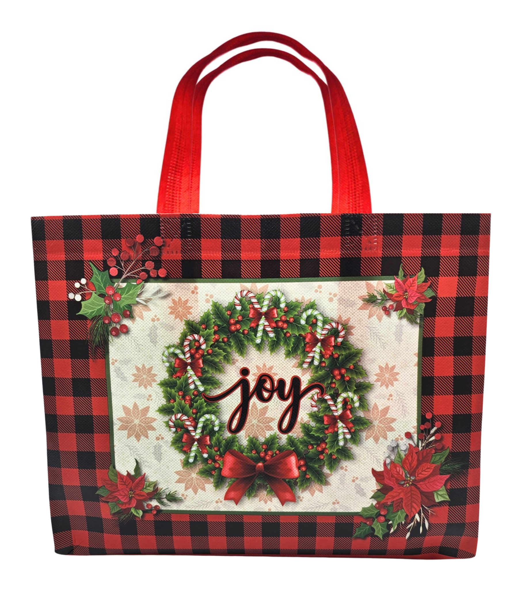Deze stijlvolle draagtas met rood geruit design en klassieke kerstkrans zorgt direct voor het ultieme kerstgevoel.