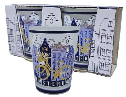 De subtiele Delfts Blauwe details en de sierlijke fiets met gevelhuisjes geven het glas een authentieke, Amsterdamse look.
