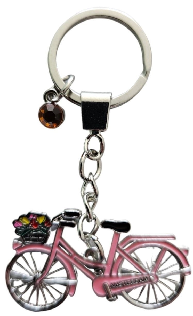 • Typisch Hollands Sleutelhanger Amsterdam - roze fiets  met bedel (strassteentje)