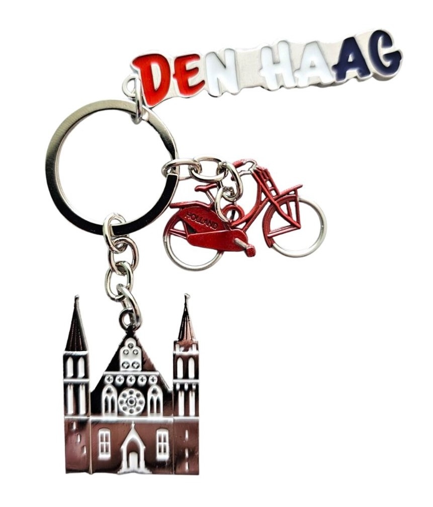 Typisch Hollandse sleutelhanger met een fiets.Tevens aan deze ring de Ridderzaal en naam-tag ( Den Haag)Kortom , wat een leuk cadeau