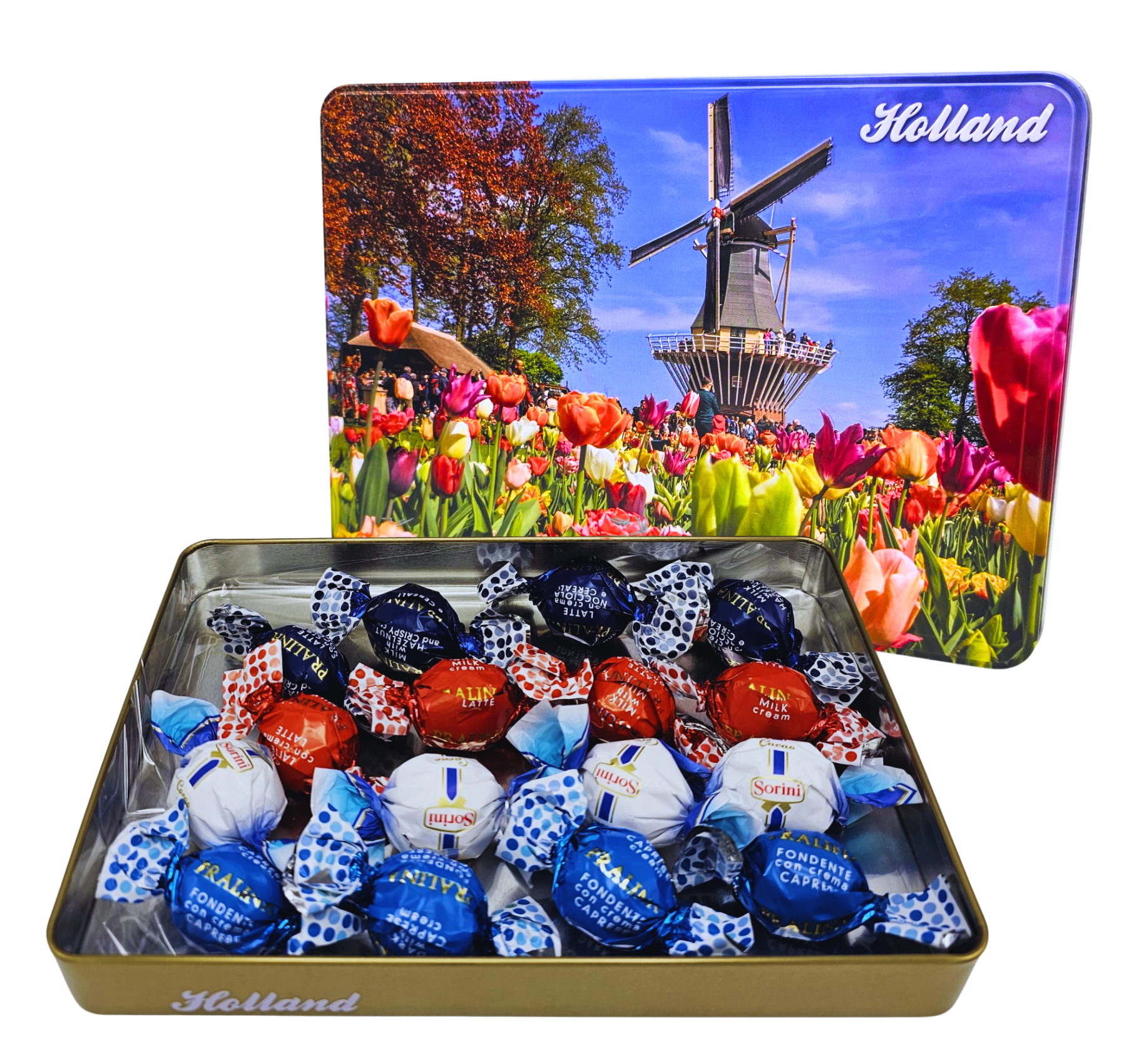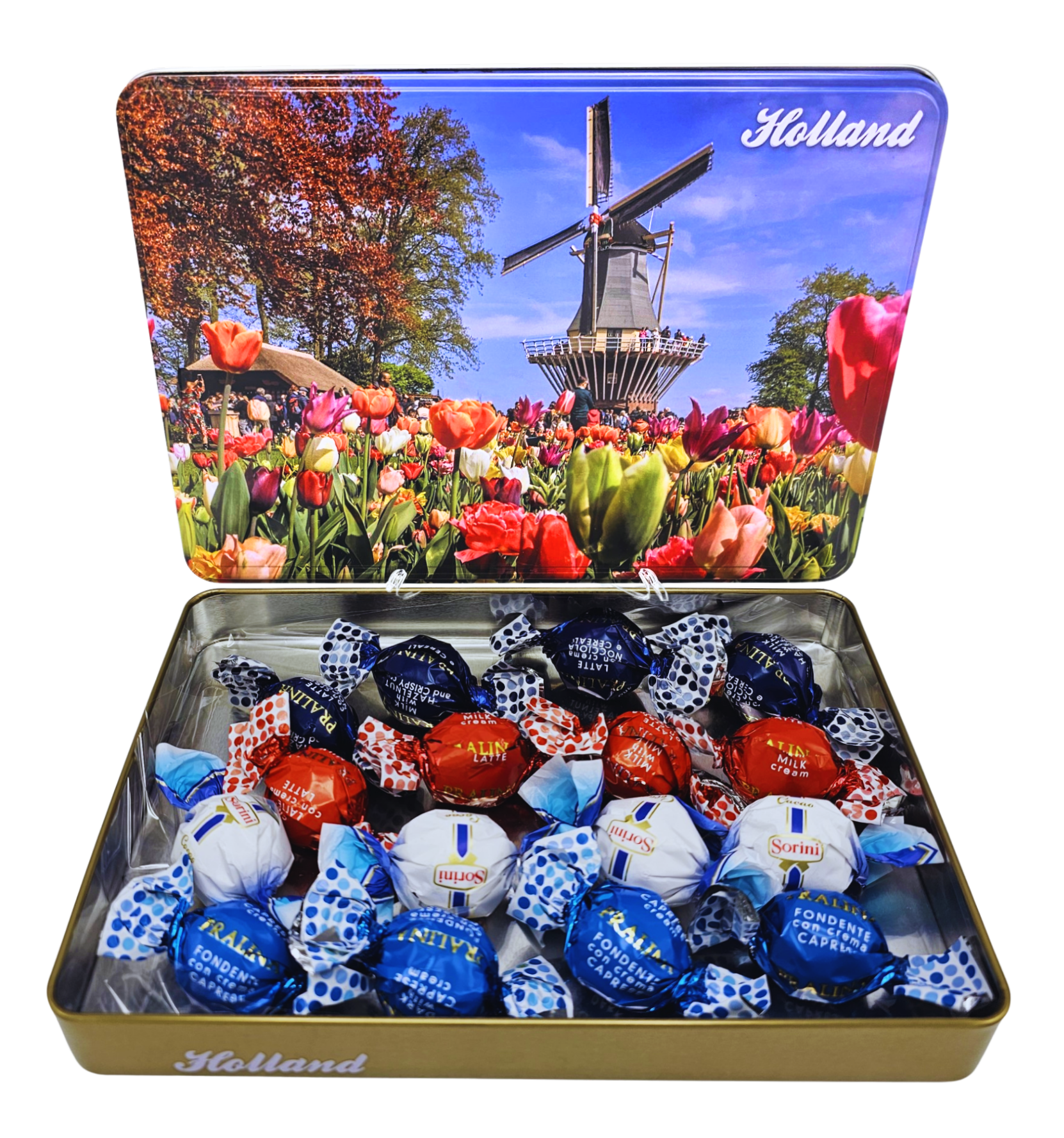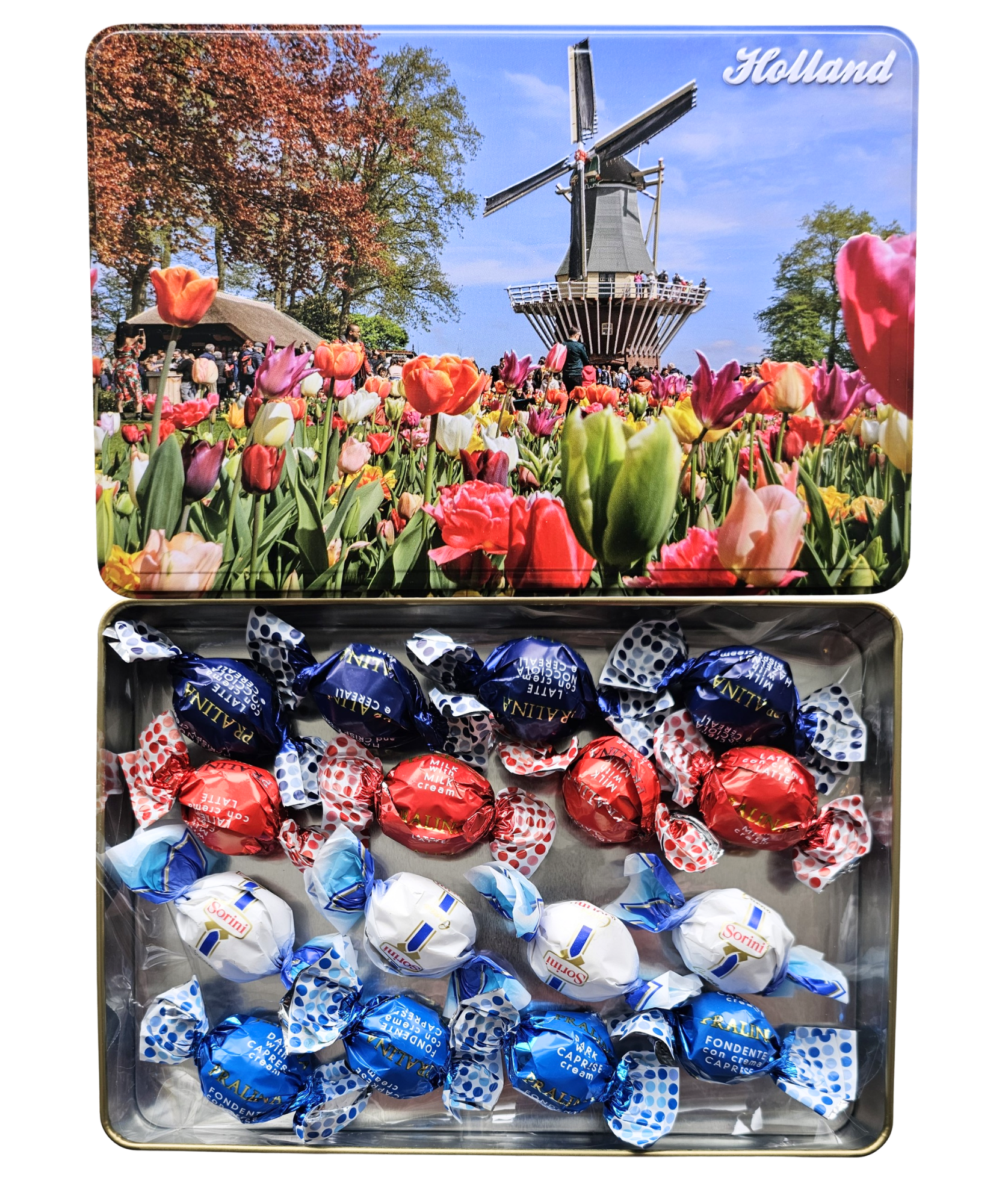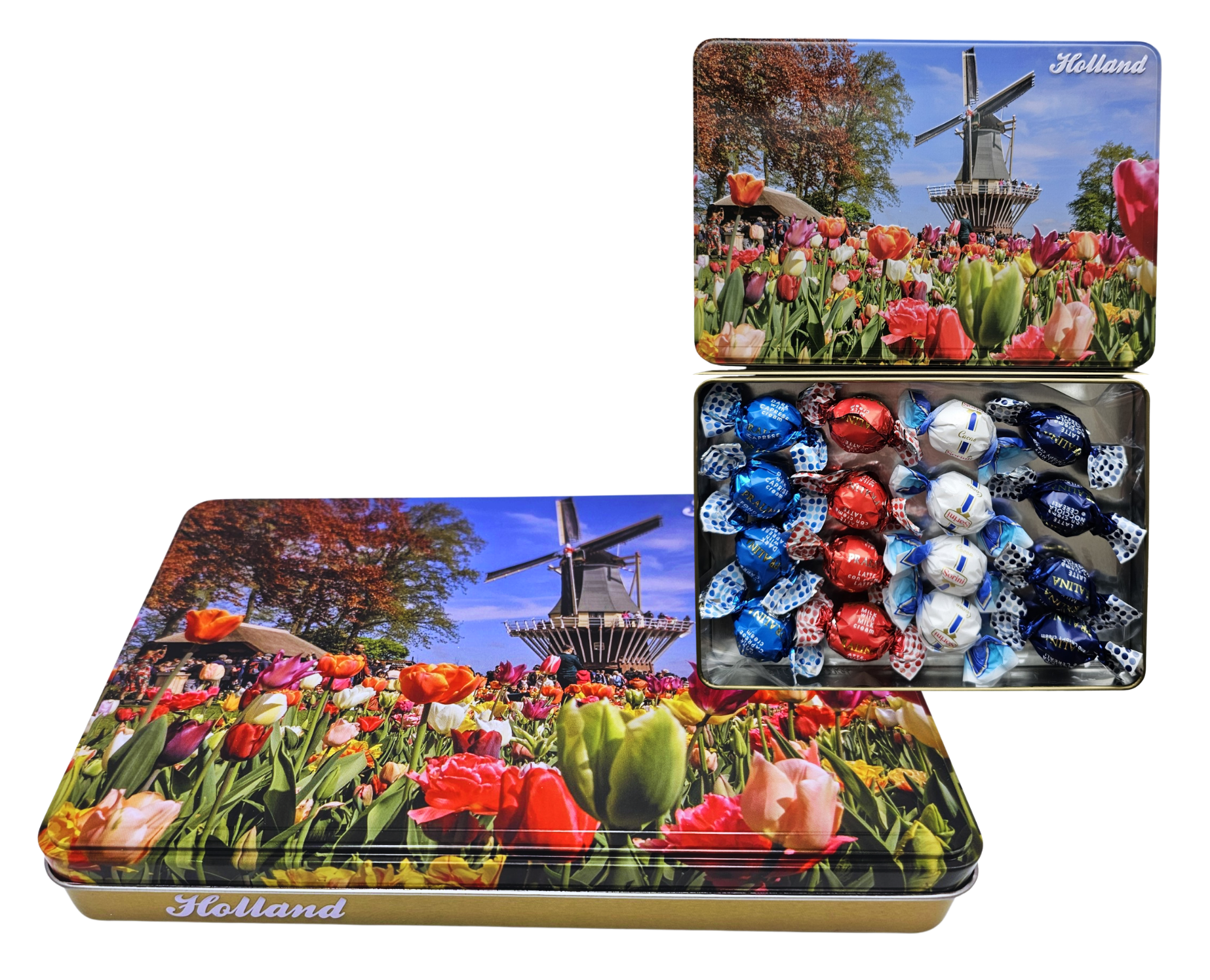 Dit vrolijke souvenirblik met kleurrijke tulpen en molens is gevuld met heerlijke chocoladebollen in vier verschillende smaken.