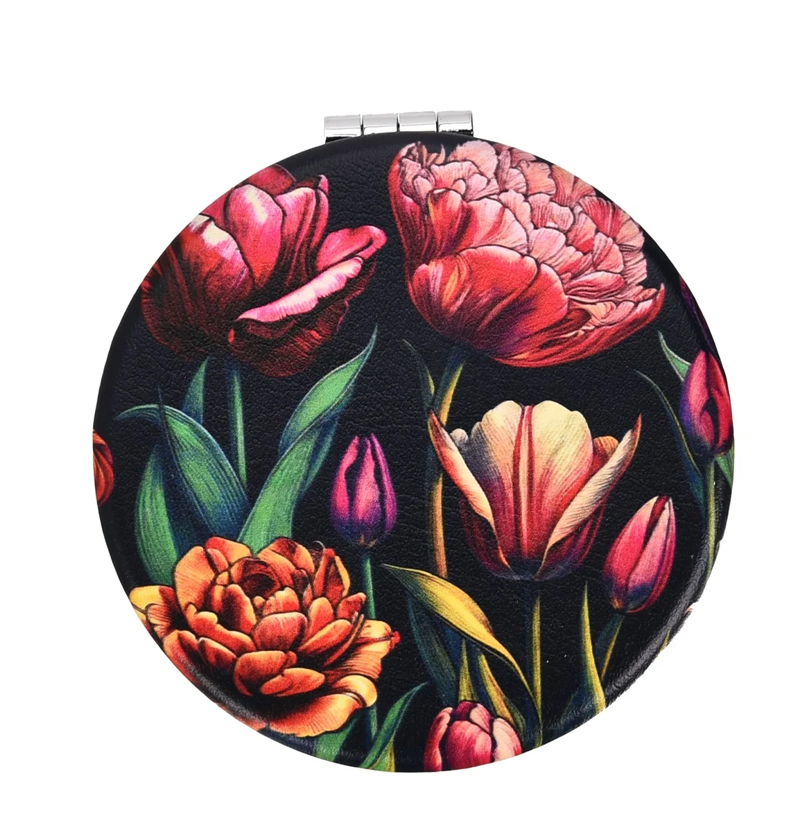 Spiegeldoos - Tulpen Zwarte - Ronde duo-spiegel | Spiegeldoos met magnetische sluiting Met een normale en een vergrotende spiegel Afmeting: 6 cm (past dus altijd in ieder tas)