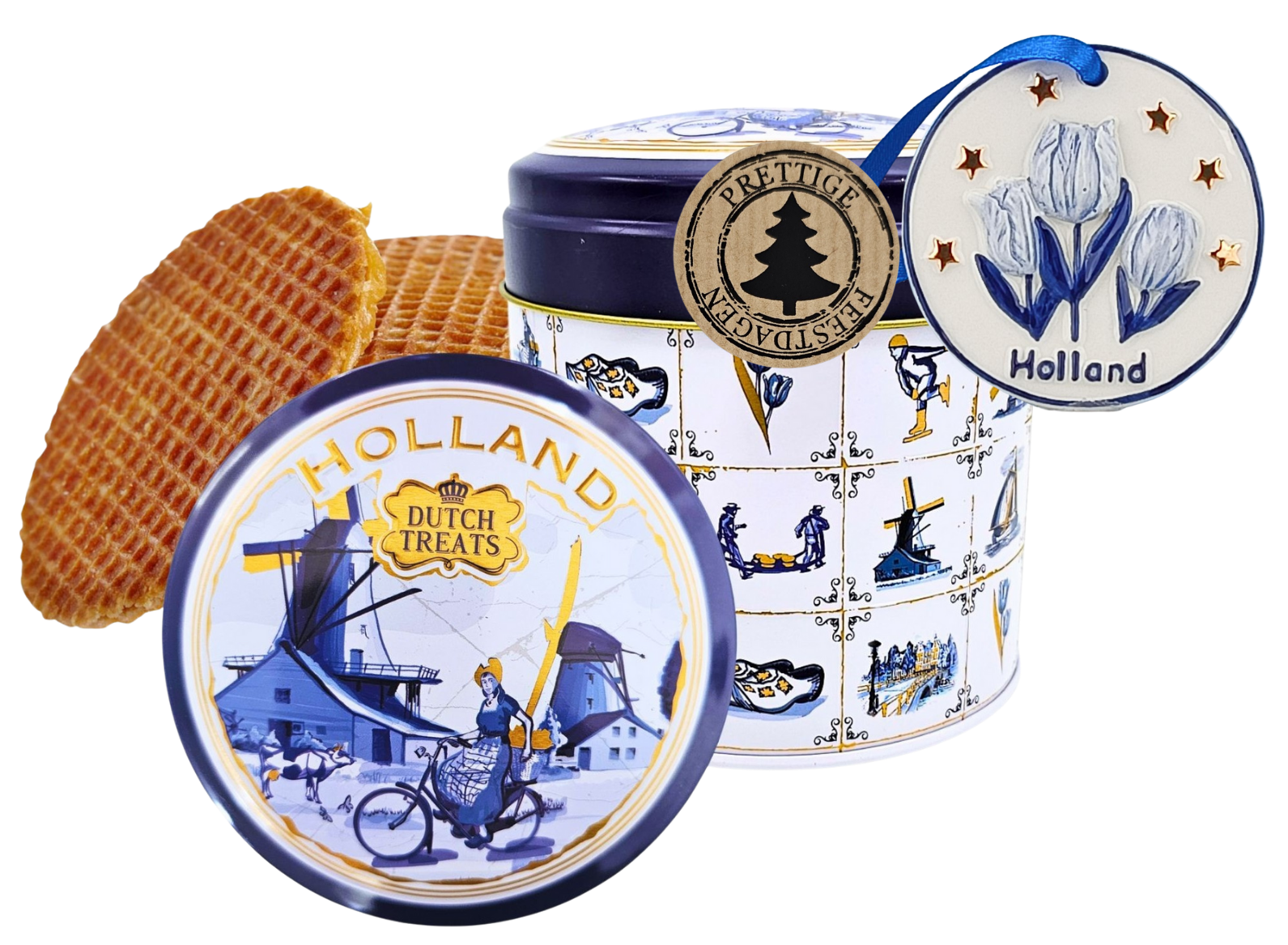 Een blik gevuld met heerlijk verse stroopwafels in Delfts blauw blik