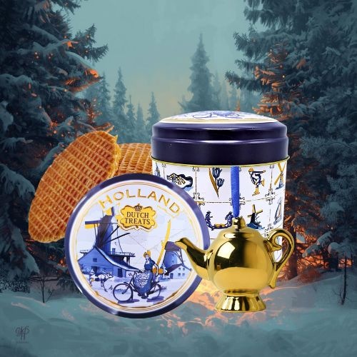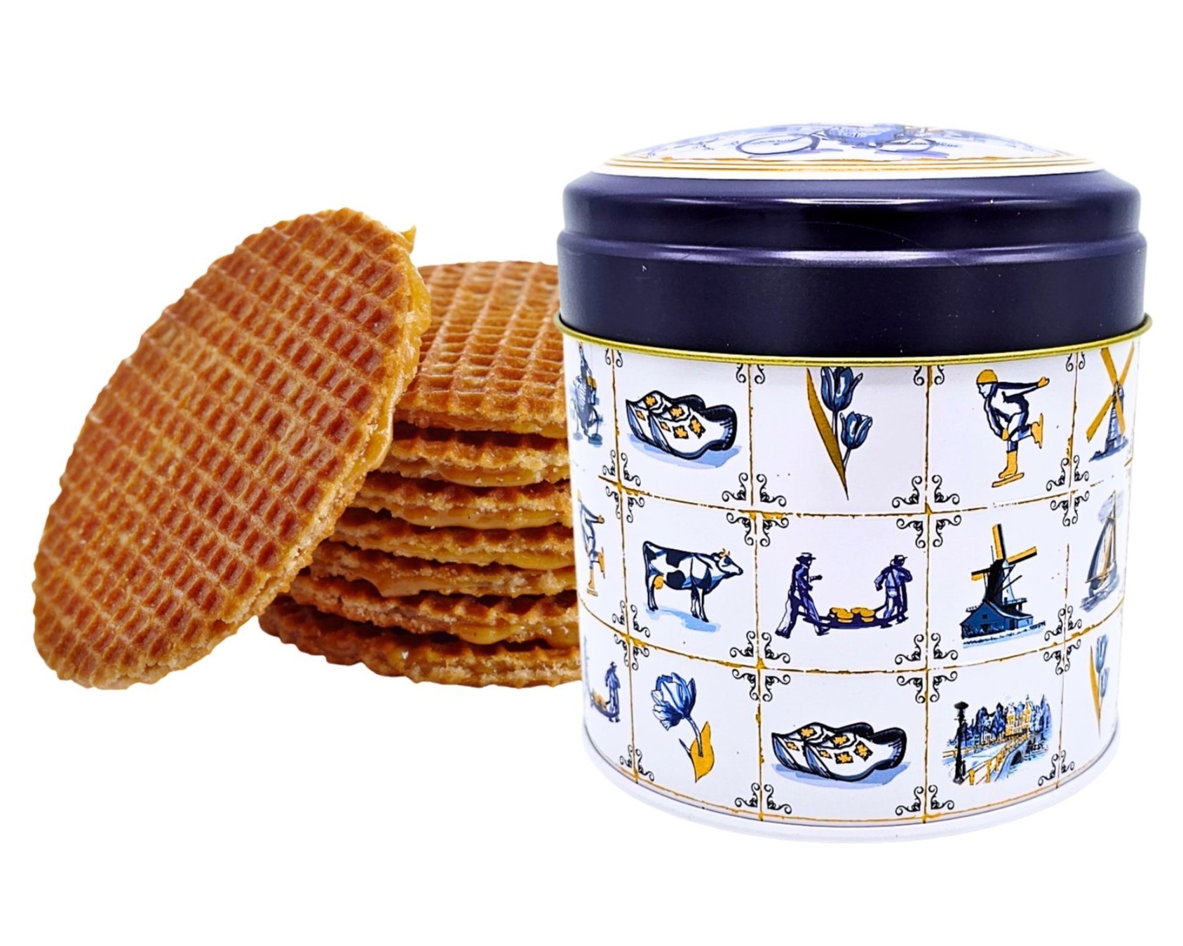 Een blik gevuld met heerlijk verse stroopwafels in Delfts blauw blik