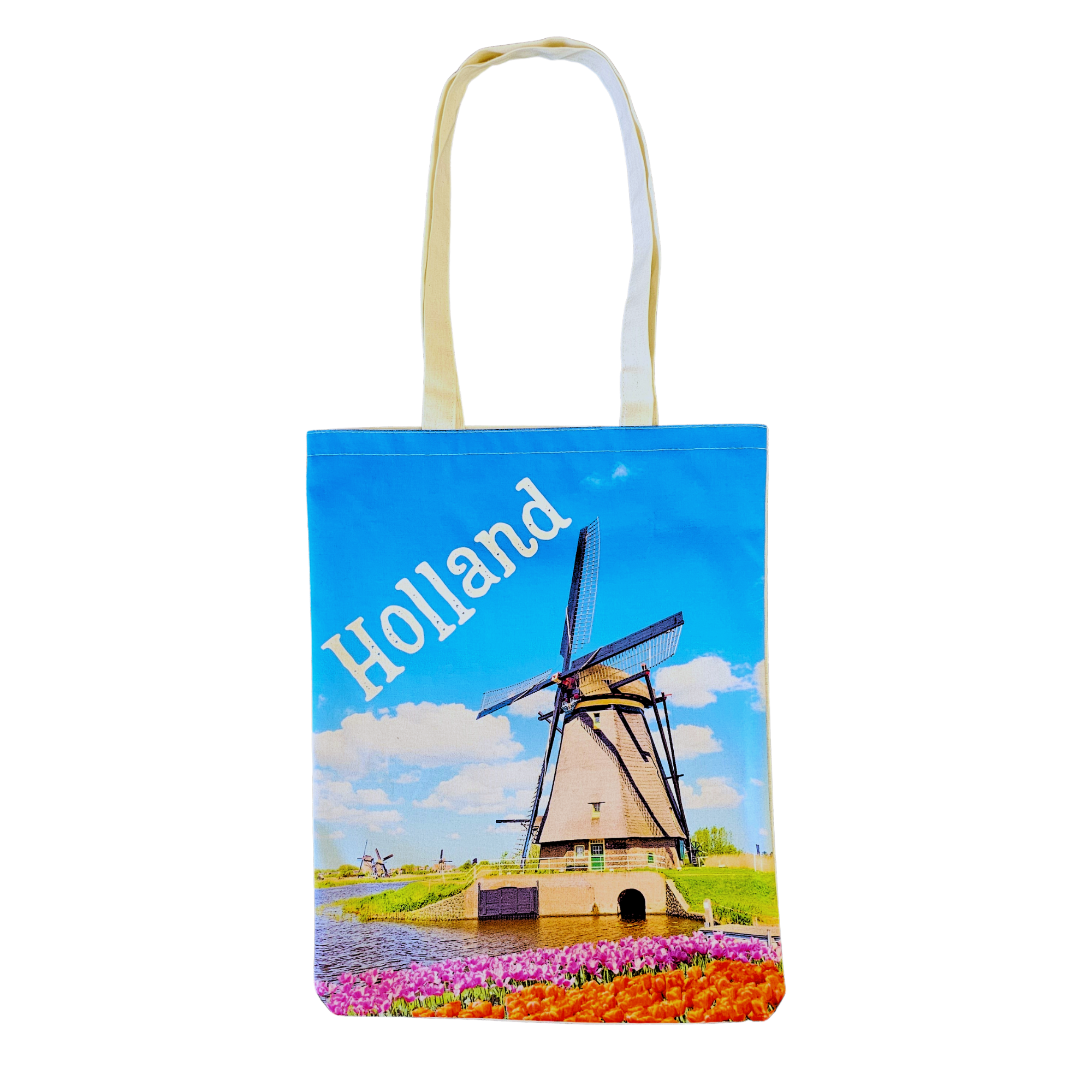 Katoenen draagtas met lange hengsels. Zoek je een leuk en praktisch Nederlands cadeau? Dit kan dan een goed idee zijn. Katoenen tas Holland - Molenlandschap. Een katoenen draagtas, dus zeg vaarwel tegen plastic!
