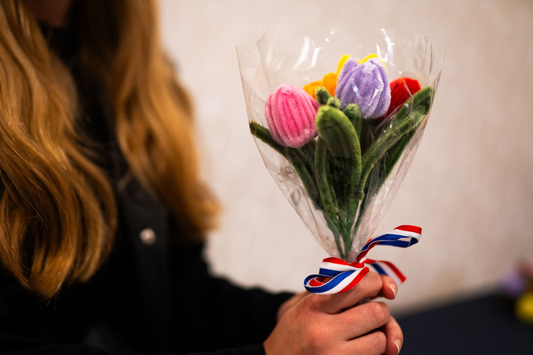 Het boeketje bestaat uit 5 sierlijke tulpen, zorgvuldig verpakt in een geschenkfolie en een Nederlands lint.
