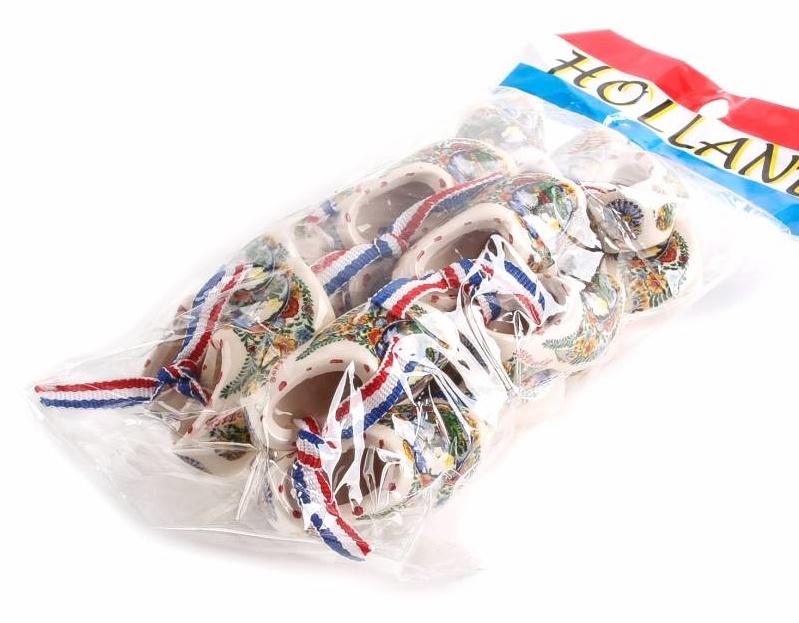 Voordeelverpakking 10 paar gekleurde klompjes. Polychrome - 5 cm Aaneen geknoopt met een Rood Wit Blauw lintje