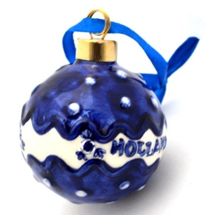 * Vervaardigd van aardewerk.* Afgewerkt met een hoogglans.* rondom gedecoreerd.* Voorzien van blauw ophanglint.* Afmeting ca. 4.5 cm