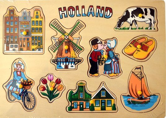 Molen, fiets, tulpjes, Grachtenhuisjes ,Koe, Klederdracht, Tulpen , klompen en tekst Holland.