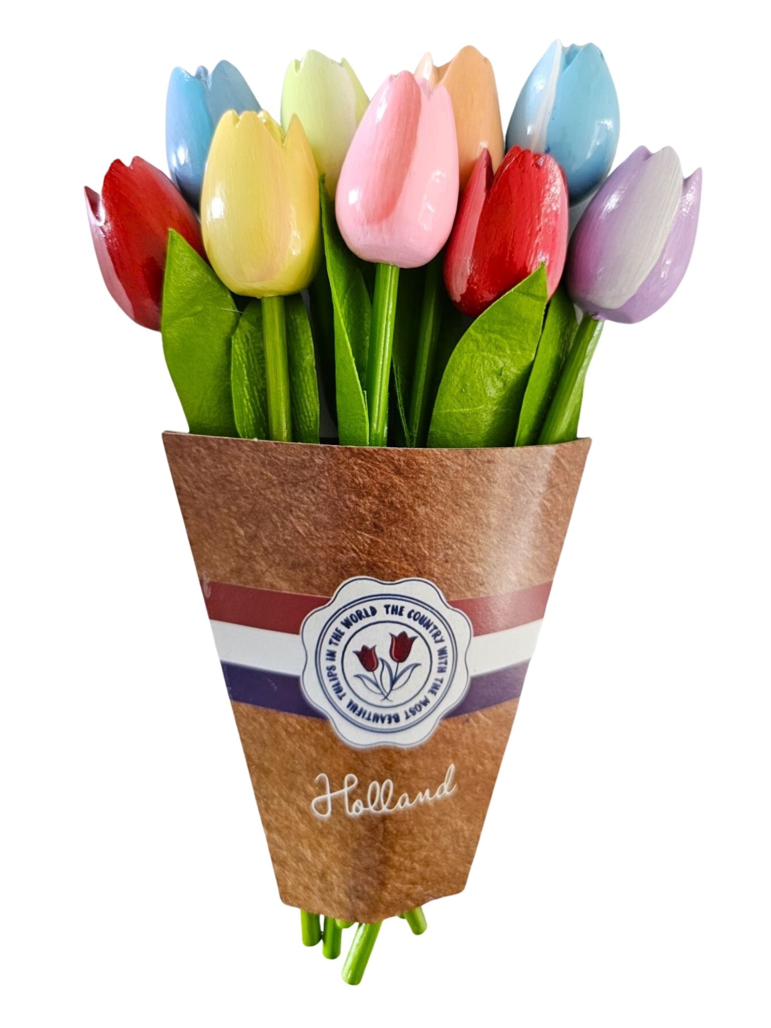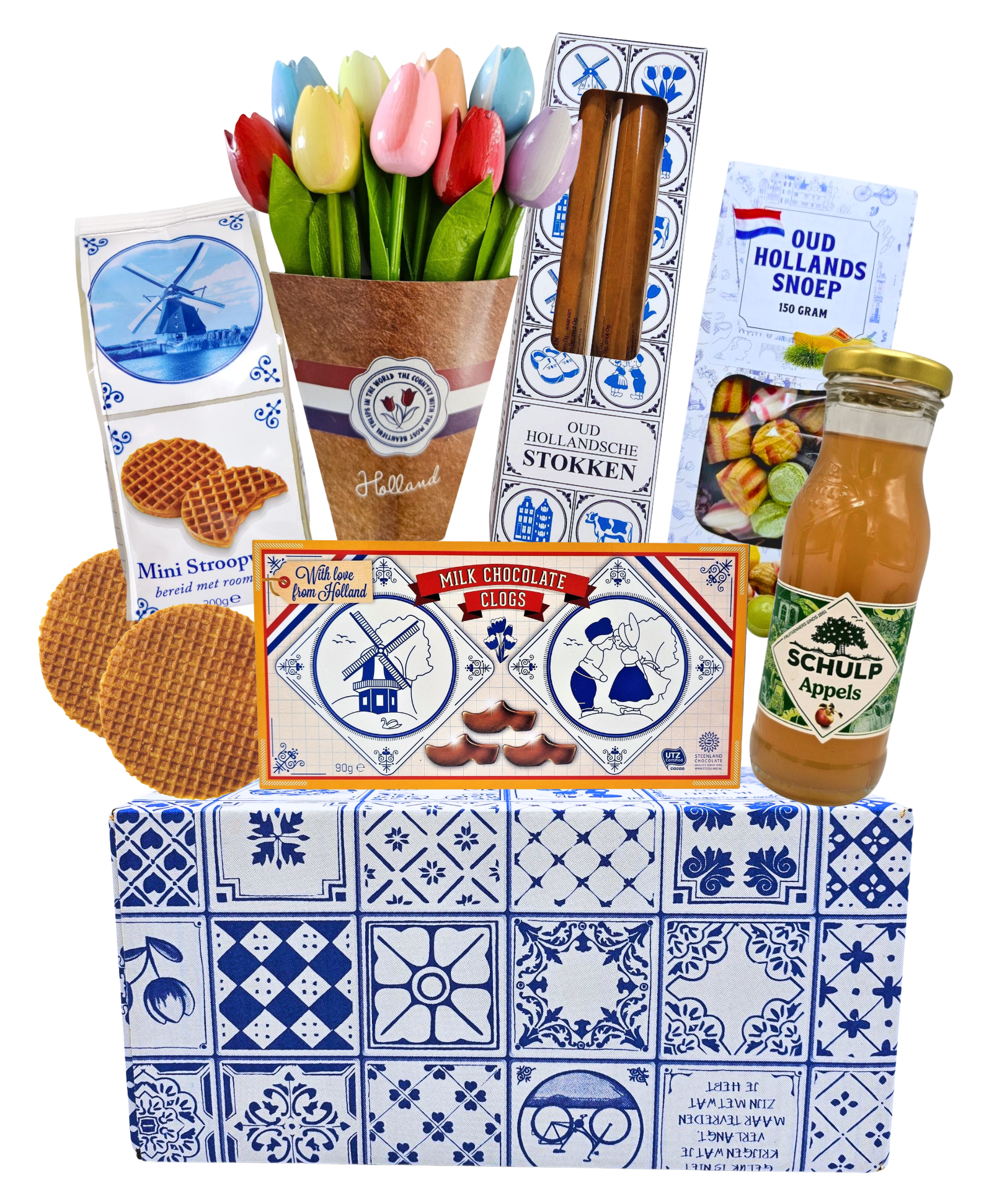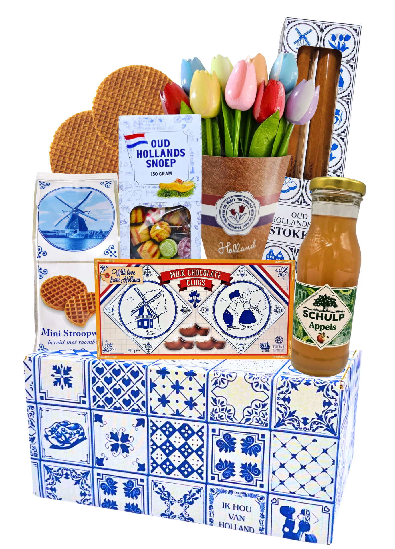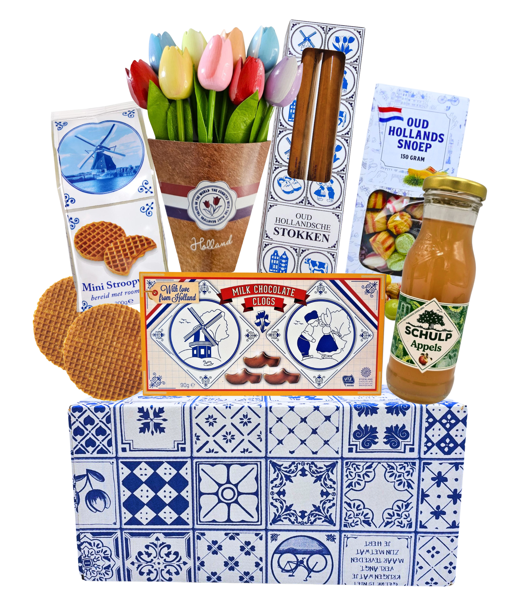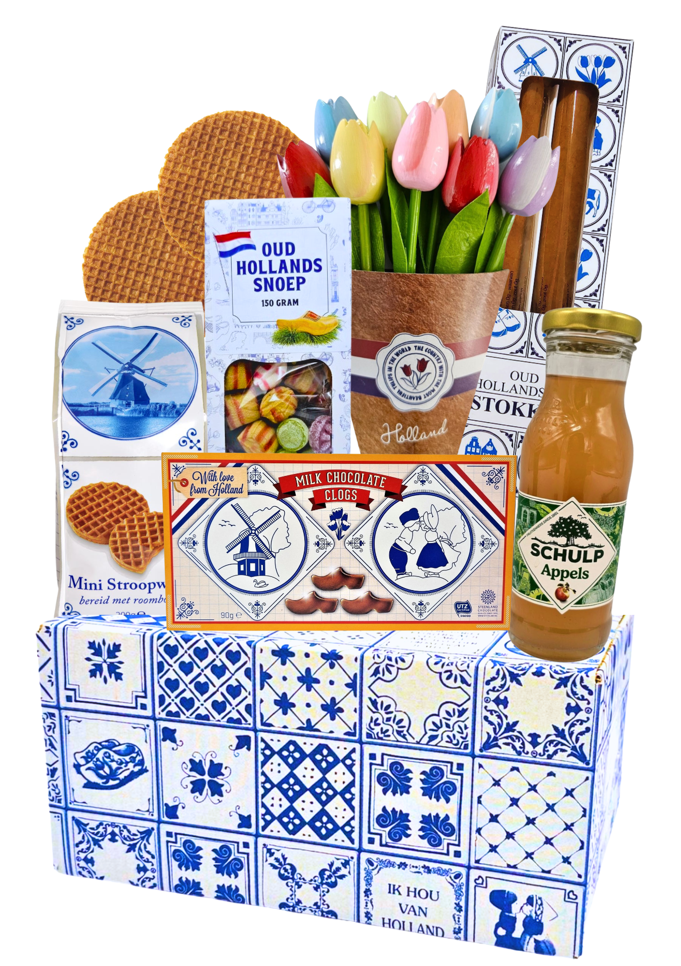 In deze Delfts blauwe geschenkdoos - een kleurrijke bos houten tulpen (20 cm lang) – een blijvend symbool van Hollandse trots – samen met een selectie heerlijke lekkernijen van eigen bodem..