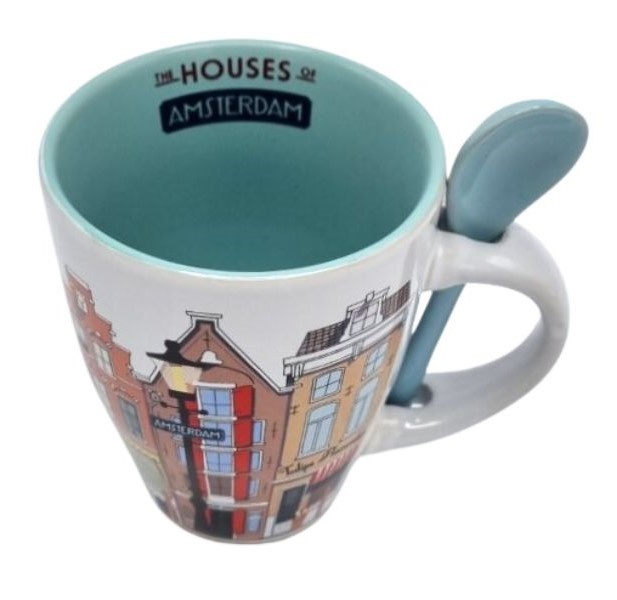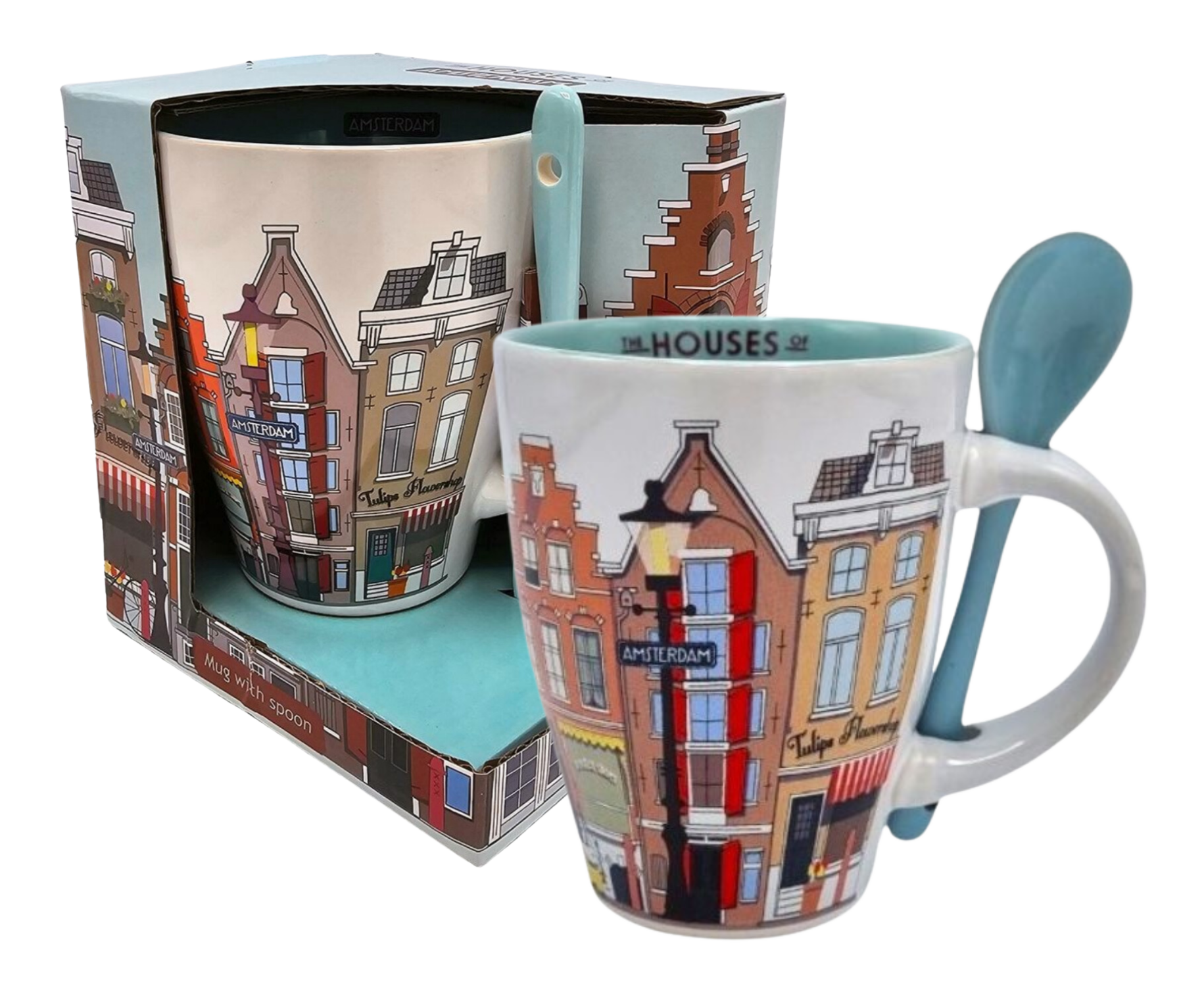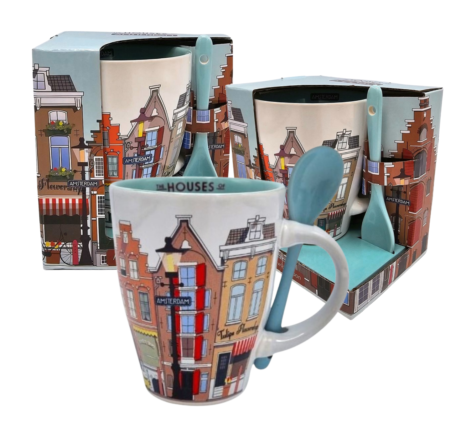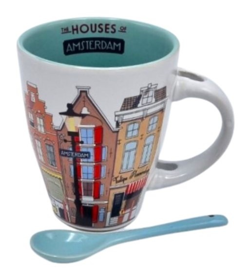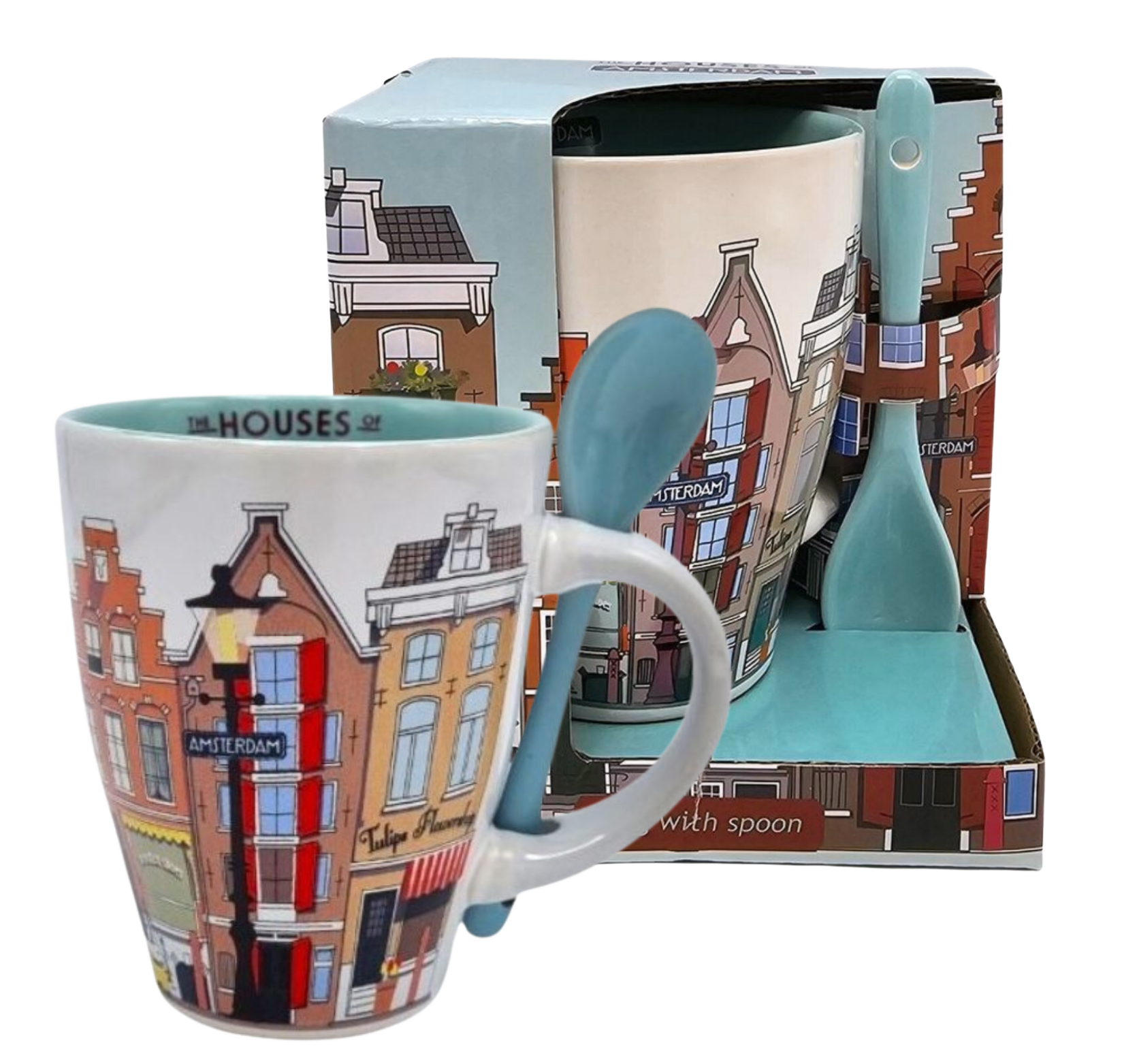 Mok en Lepel Amsterdam Afbeelding : Amsterdamse grachtenhuizen Afmeting: 10x8 cm Vervaardigd van degelijk aardewerk -keramiek In waanzinnig mooi geschenkdoos