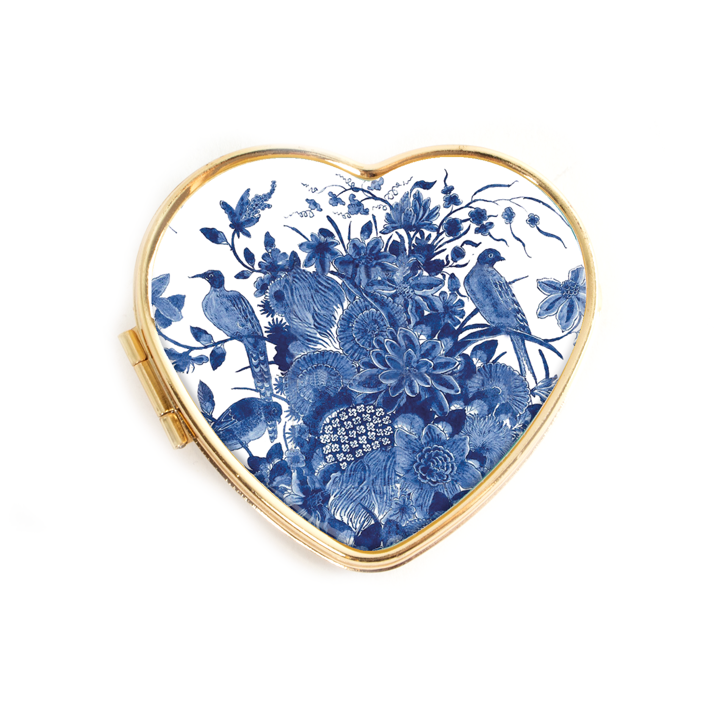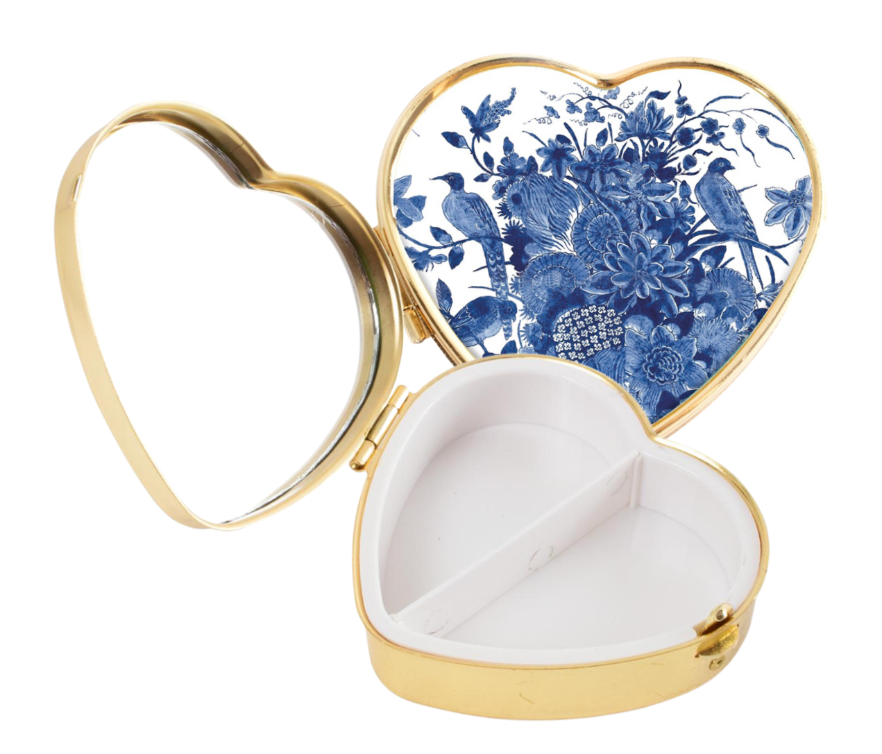 Met een druk op het knopje opent u het hartvormige pillendoosje wat ook een spiegeltje heeft