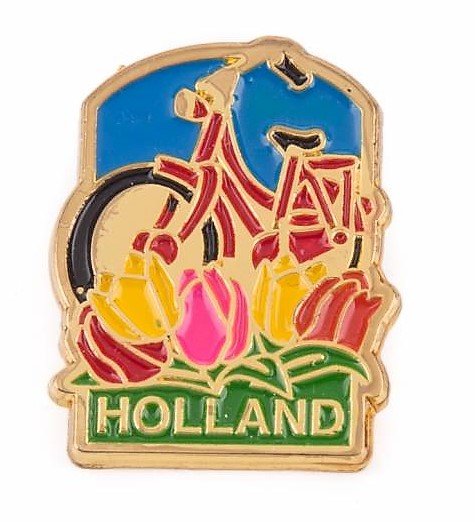 • Typisch Hollands Pin rode fiets met tulpen Holland goud