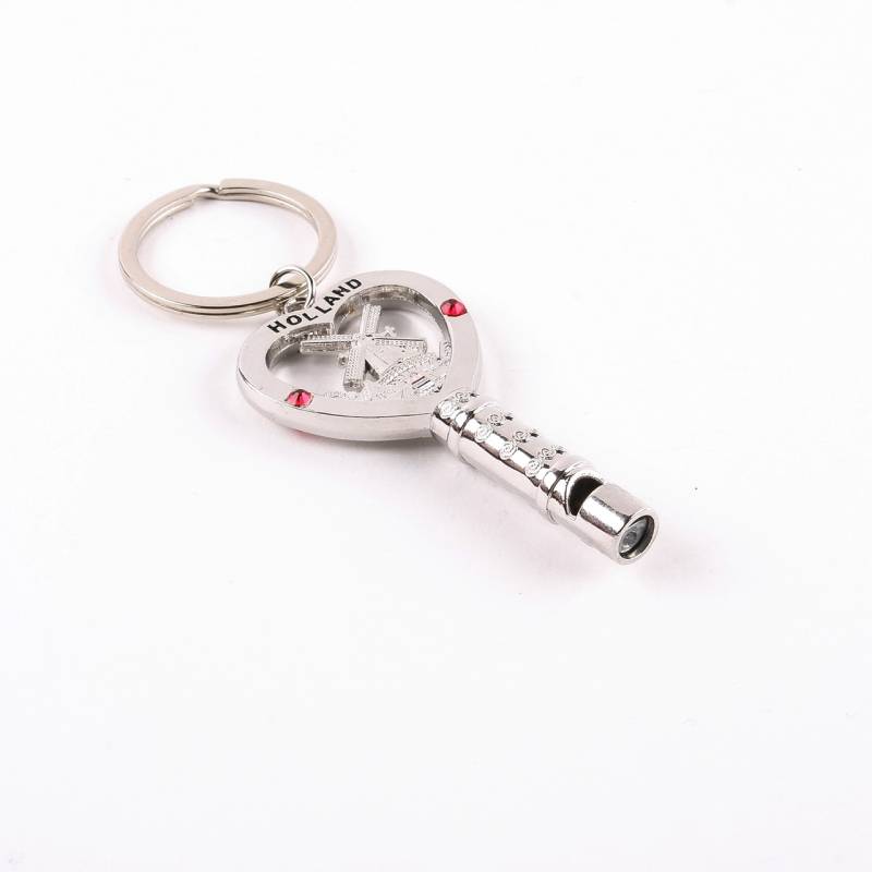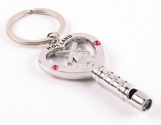 Sleutelhanger Holland Hartvormige sleutelhanger met fluitje •Uitvoering in shiny zilver en rode steentjes •Tekst Holland- Molen