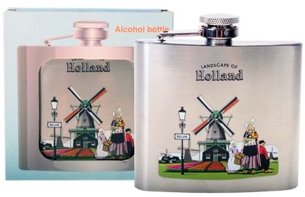 Heupflesje Holland Op de fles als decoratie : Lanschap molens - Hollands Dit heupflesje wordt geleverd in een kartonnen geschenkverpakking Deze kleine metalen heupfles is ideaal voor het discreet vervoeren van een kleine hoeveelheid alcoho...