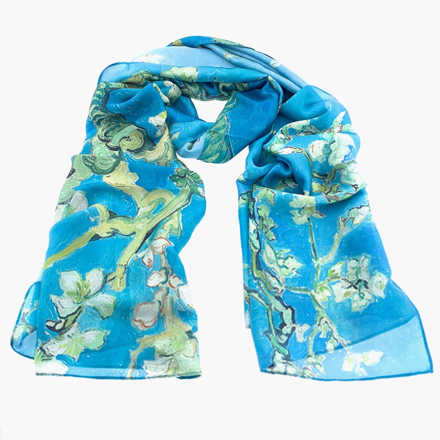 Stijlvolle sjaal met de iconische ‘Amandelbloesem’ van Vincent van Gogh. Gemaakt van zijdezacht viscose (190 x 65 cm) voor optimaal draagcomfort. Een elegant en kunstzinnig Hollands sieraad om te dragen. Direct uit voorraad leverbaar!