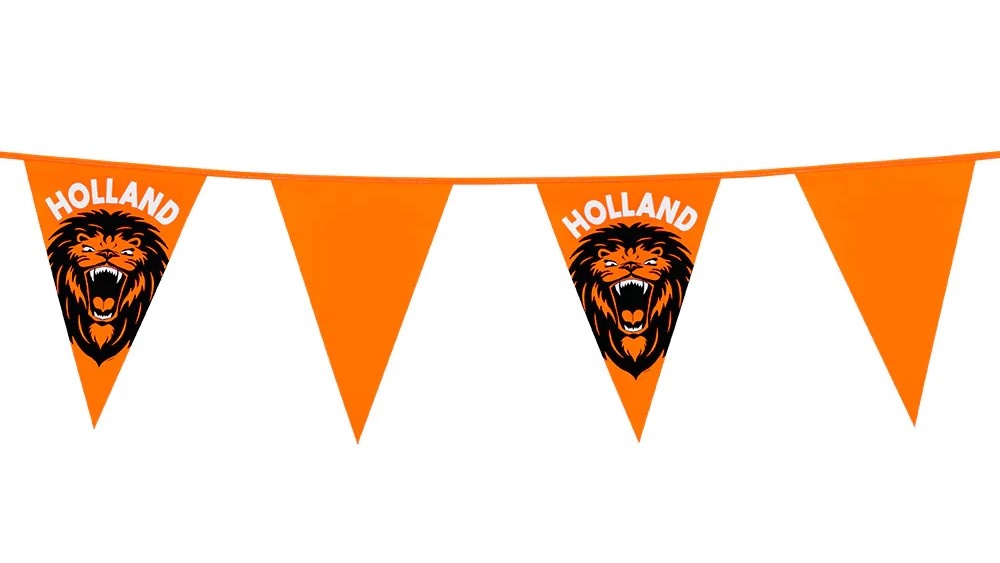 Met zijn opvallende oranje kleur en een stoere print van een leeuw brengt deze 6 meter lange PE vlaggenlijn een gevoel van nationale trots. Het aanmoedigen van het Nederlands Elftal wordt nu nog leuker!
