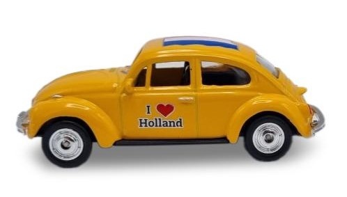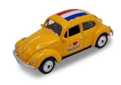 Volkswagen Kever- Holland - schaal 1:60 Geel Miniatuur Volkswagen kever met de Nederlandse vlag op het dak •Op schaal: 1:60 - geel •Geschikt voor kinderen vanaf 6 jaar
